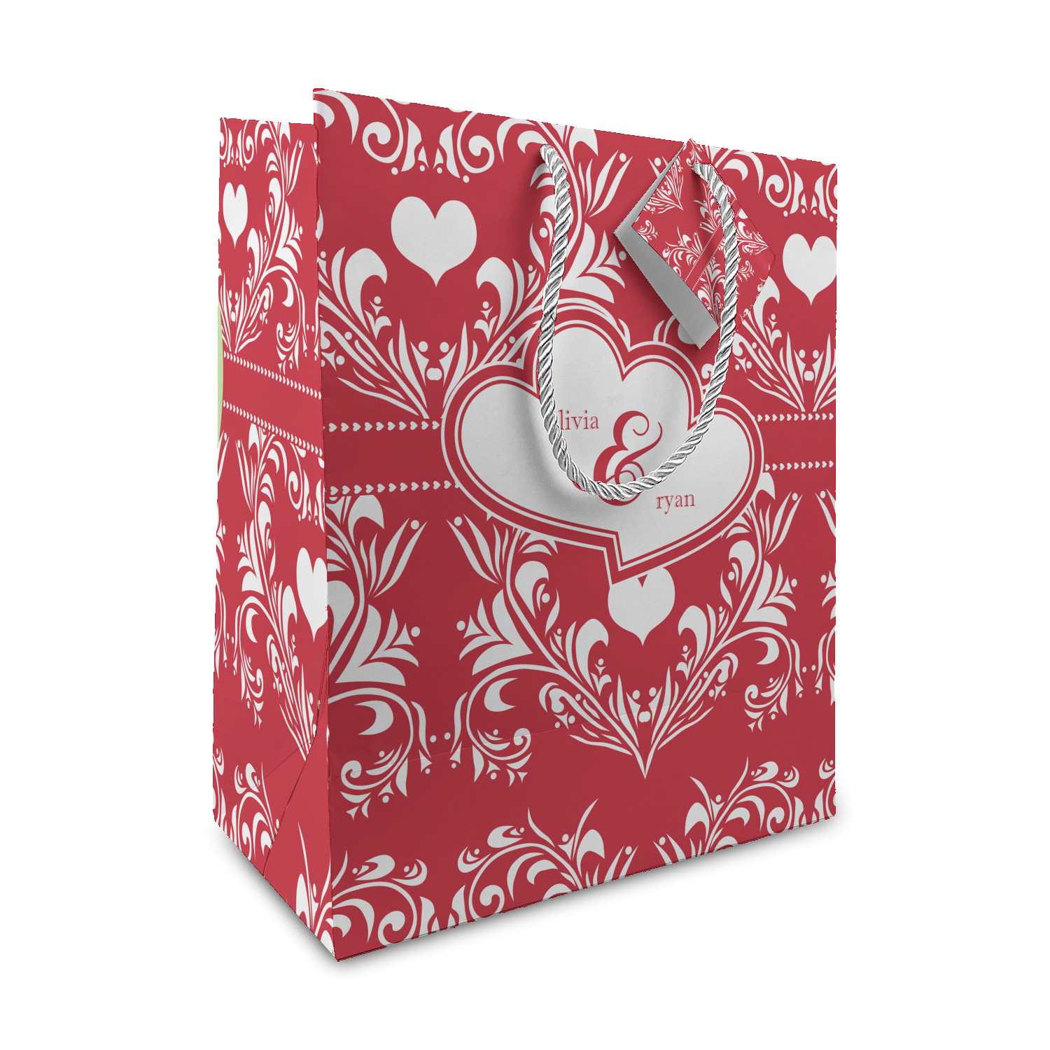 Two toned red damask hearts fill the solid red background with nothing but love. Tiny hearts link together to form a ribbon than anchor the two linking heart label. Personalize with two names to complete this love inspired damask design.