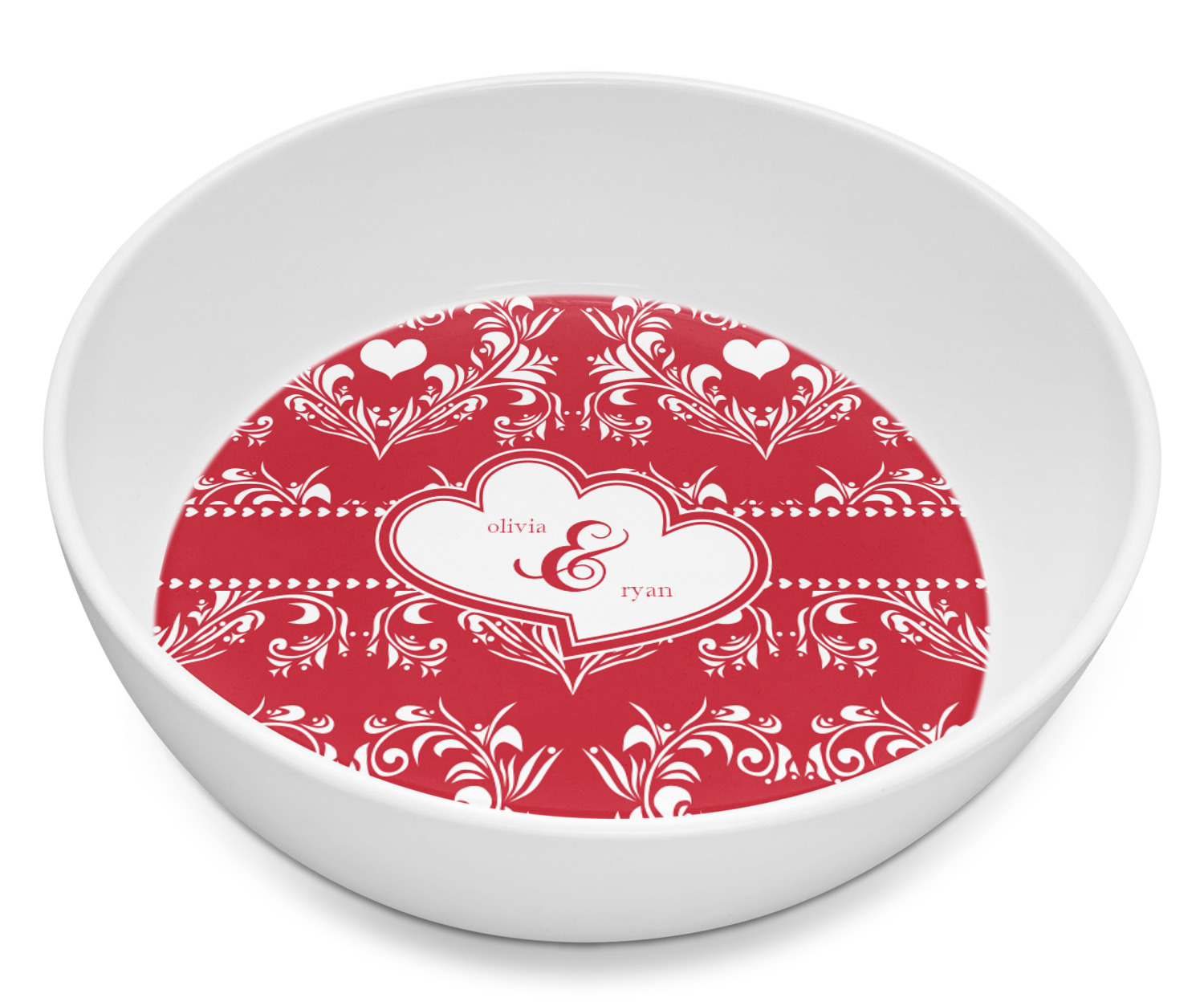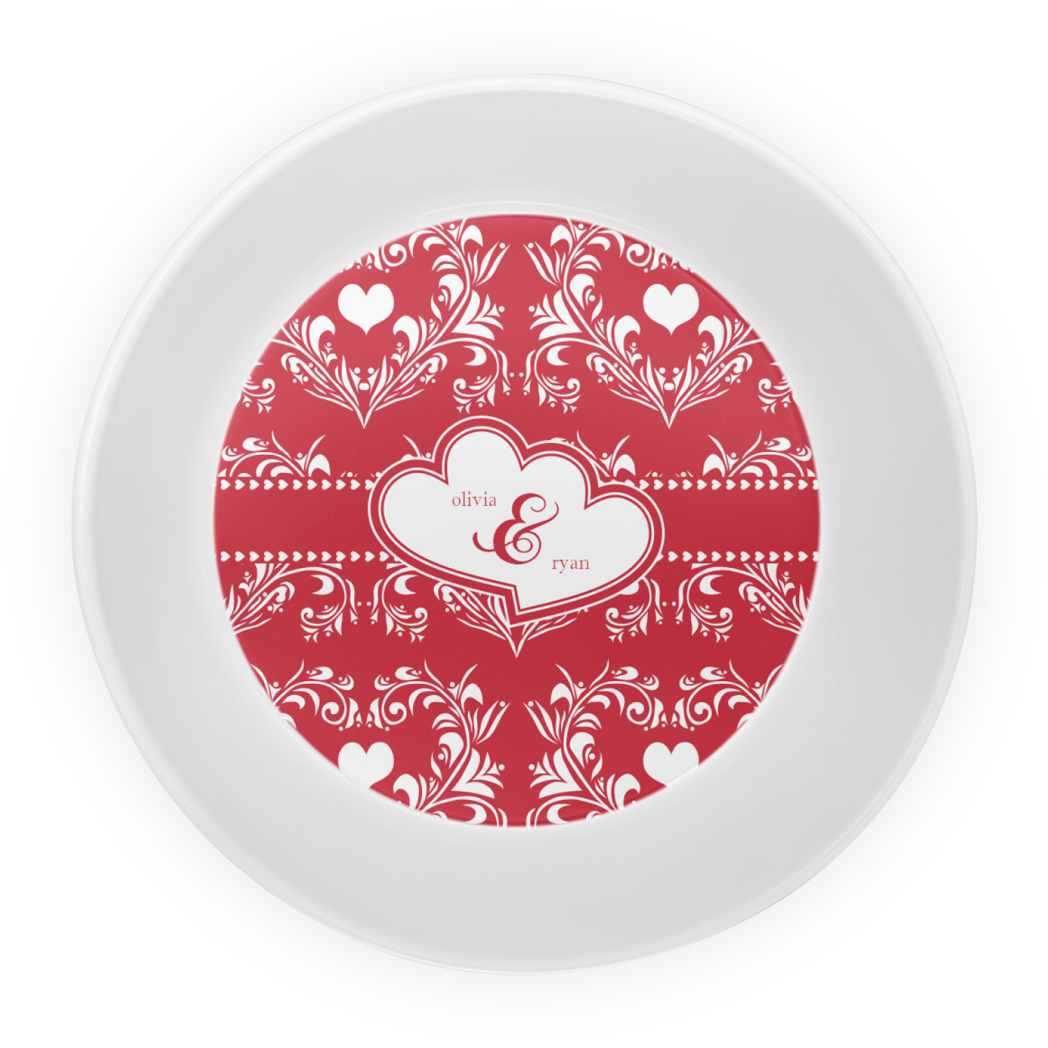 Two toned red damask hearts fill the solid red background with nothing but love. Tiny hearts link together to form a ribbon than anchor the two linking heart label. Personalize with two names to complete this love inspired damask design.