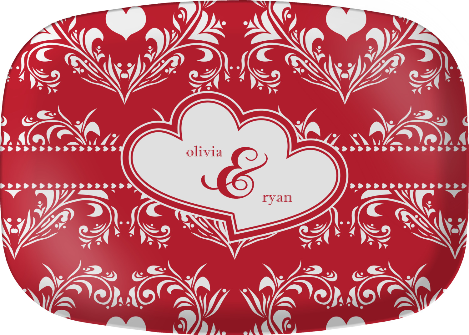 Two toned red damask hearts fill the solid red background with nothing but love. Tiny hearts link together to form a ribbon than anchor the two linking heart label. Personalize with two names to complete this love inspired damask design.