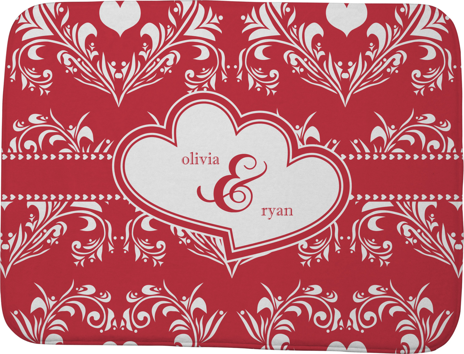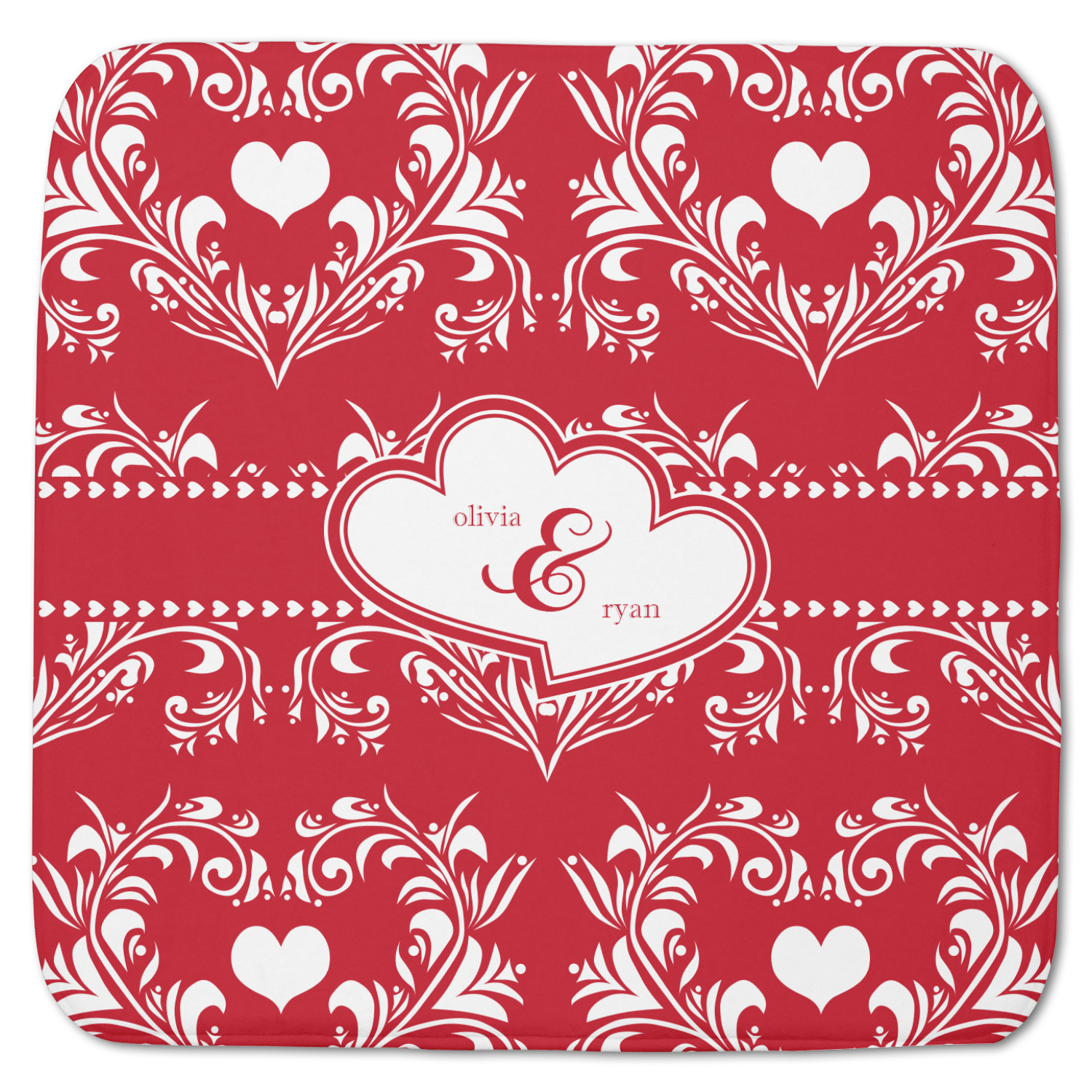 Two toned red damask hearts fill the solid red background with nothing but love. Tiny hearts link together to form a ribbon than anchor the two linking heart label. Personalize with two names to complete this love inspired damask design.