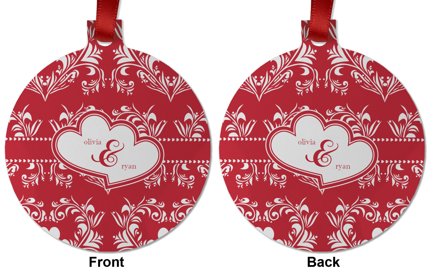 Two toned red damask hearts fill the solid red background with nothing but love. Tiny hearts link together to form a ribbon than anchor the two linking heart label. Personalize with two names to complete this love inspired damask design.