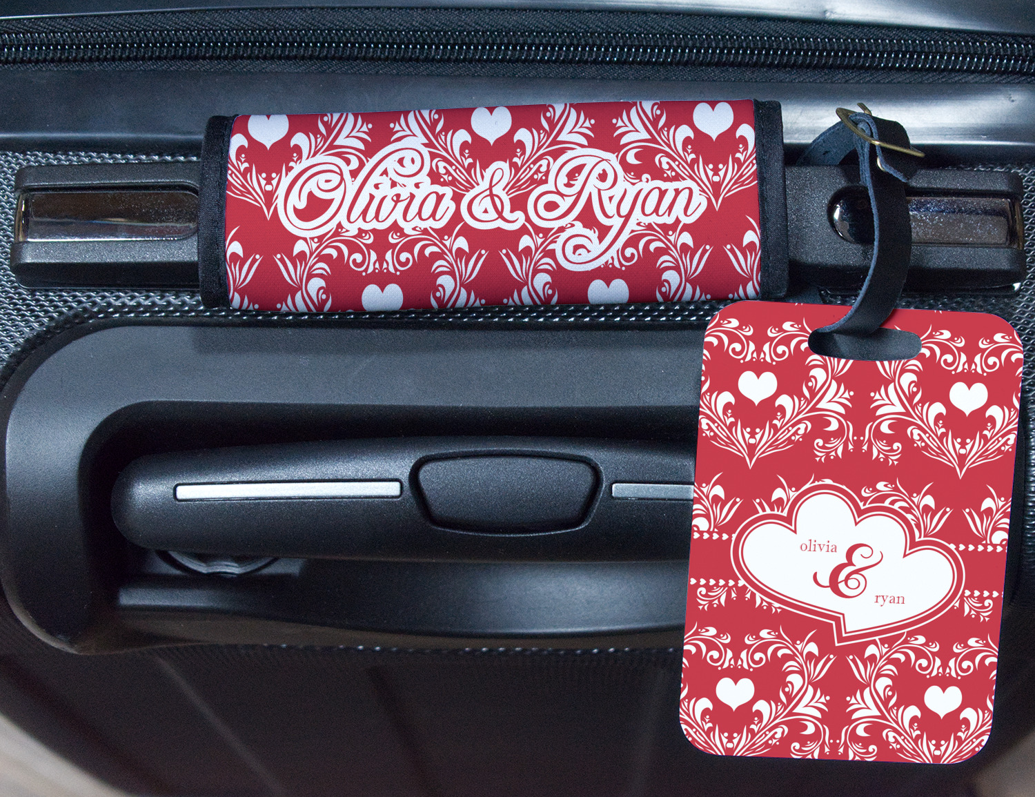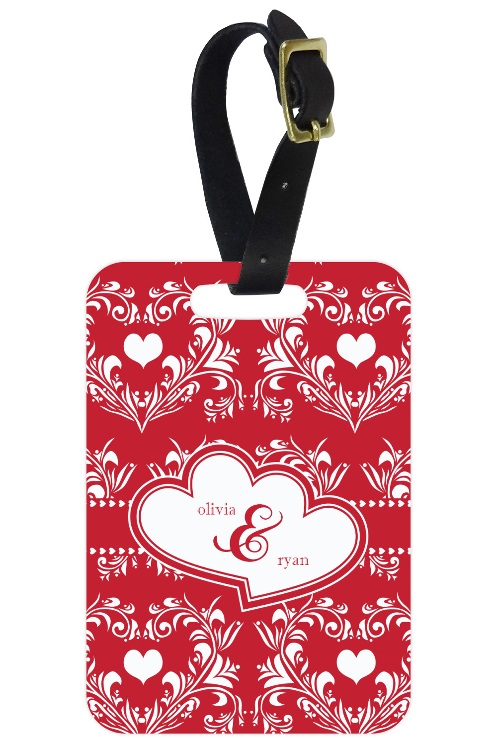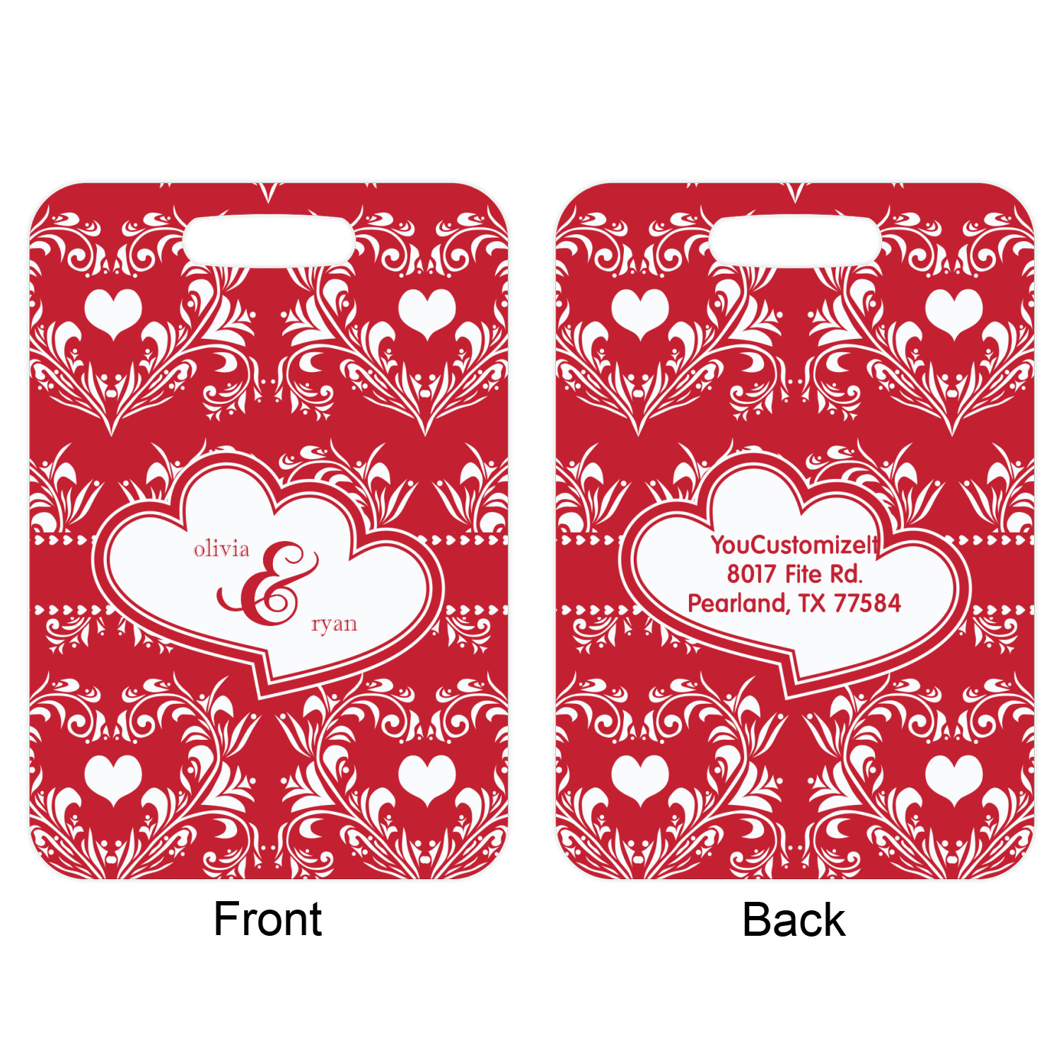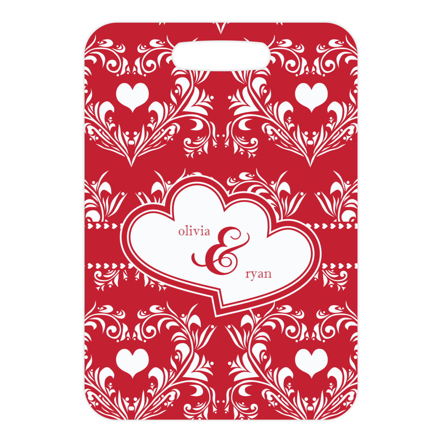 Two toned red damask hearts fill the solid red background with nothing but love. Tiny hearts link together to form a ribbon than anchor the two linking heart label. Personalize with two names to complete this love inspired damask design.