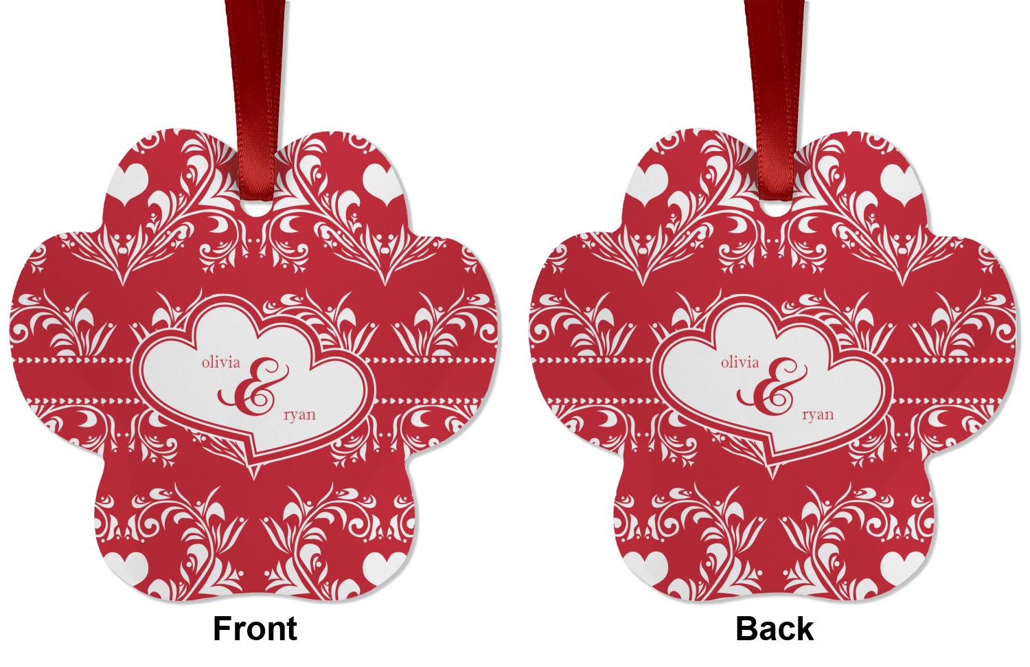 Two toned red damask hearts fill the solid red background with nothing but love. Tiny hearts link together to form a ribbon than anchor the two linking heart label. Personalize with two names to complete this love inspired damask design.