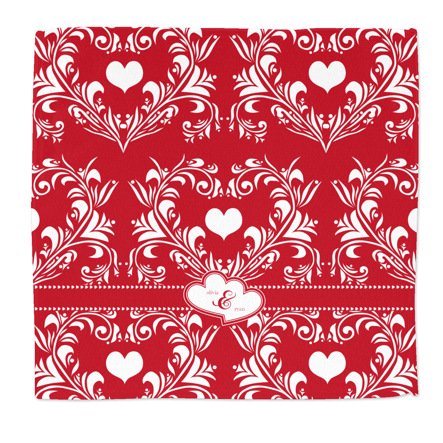 Two toned red damask hearts fill the solid red background with nothing but love. Tiny hearts link together to form a ribbon than anchor the two linking heart label. Personalize with two names to complete this love inspired damask design.