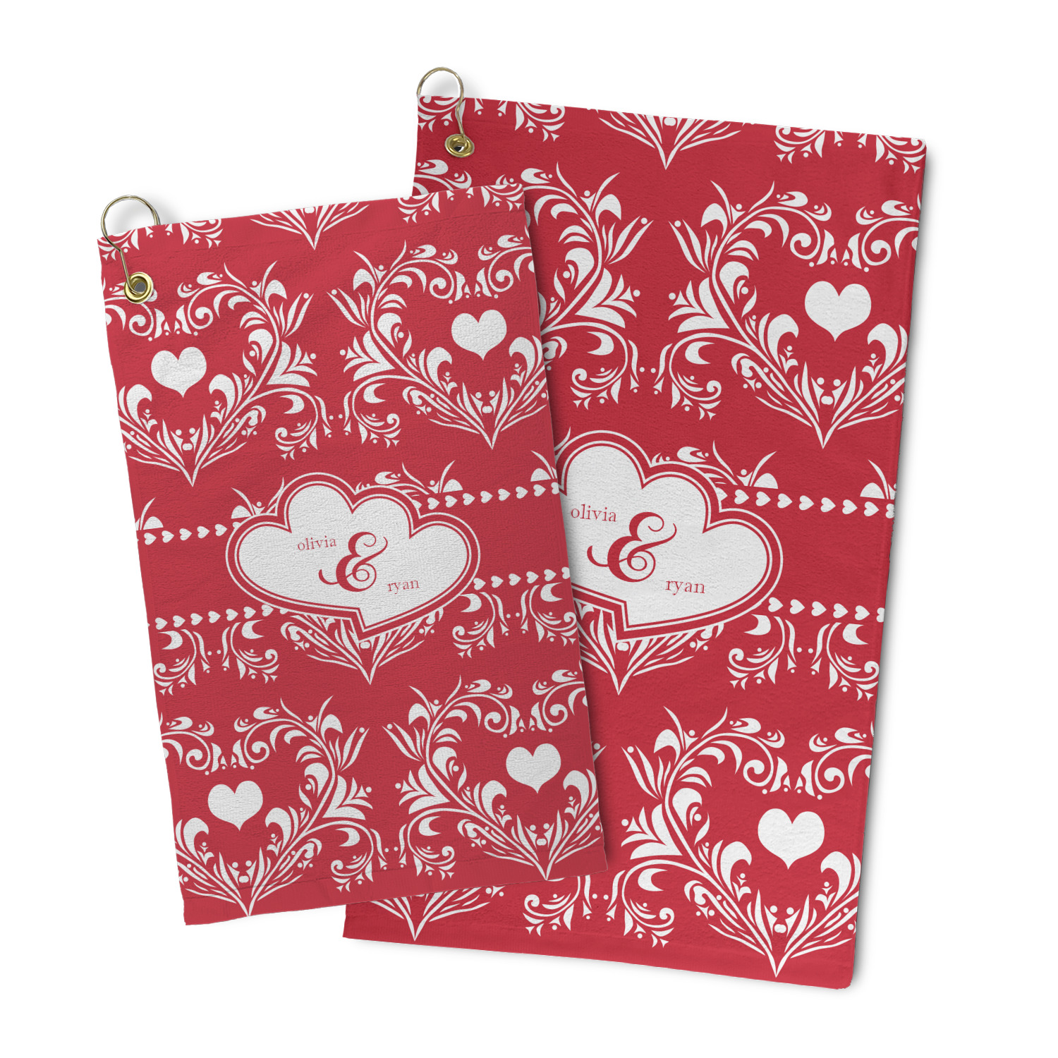 Two toned red damask hearts fill the solid red background with nothing but love. Tiny hearts link together to form a ribbon than anchor the two linking heart label. Personalize with two names to complete this love inspired damask design.