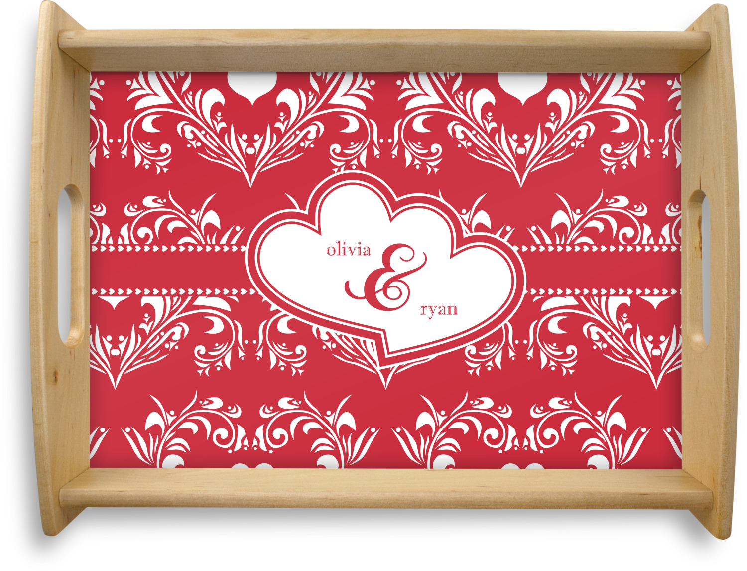 Two toned red damask hearts fill the solid red background with nothing but love. Tiny hearts link together to form a ribbon than anchor the two linking heart label. Personalize with two names to complete this love inspired damask design.