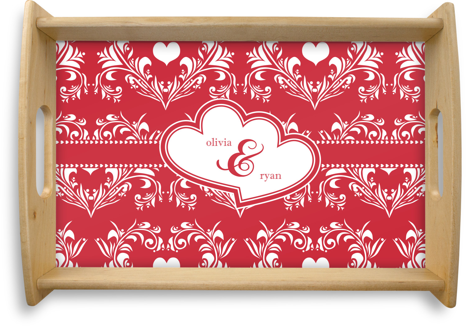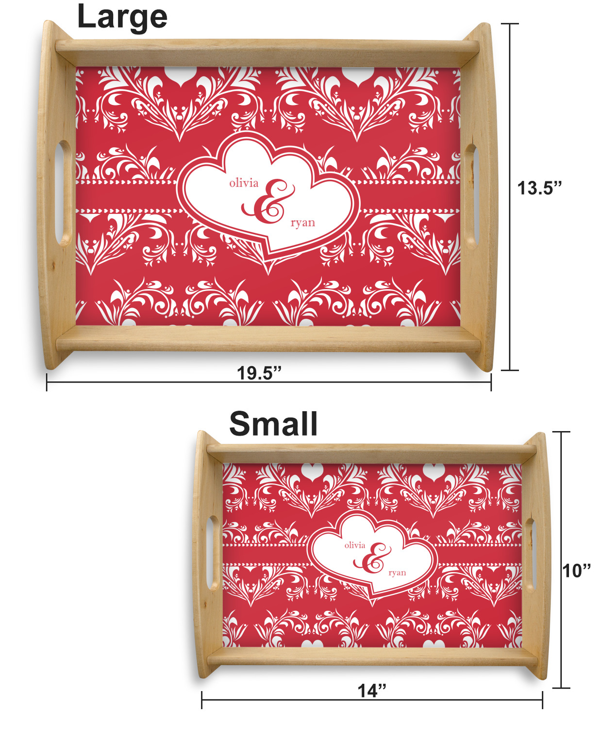 This serving tray with handles features square edges and two rounded sides, creating a very modern look. Each side is fabricated from a beautifully cut, natural wood. The bottom of the interior of the tray displays your customized design in bright, vibrant color. The tray is sold in both a black color and a natural wood look. Each variation of the wood serving tray has two sizes: Small, which is 14" x 10" x 2.25", and Large, which is 19.5" x 13.5" x 2.75".