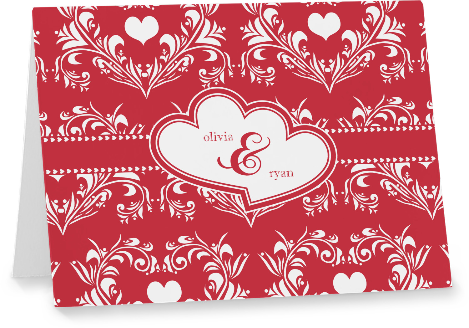 Two toned red damask hearts fill the solid red background with nothing but love. Tiny hearts link together to form a ribbon than anchor the two linking heart label. Personalize with two names to complete this love inspired damask design.