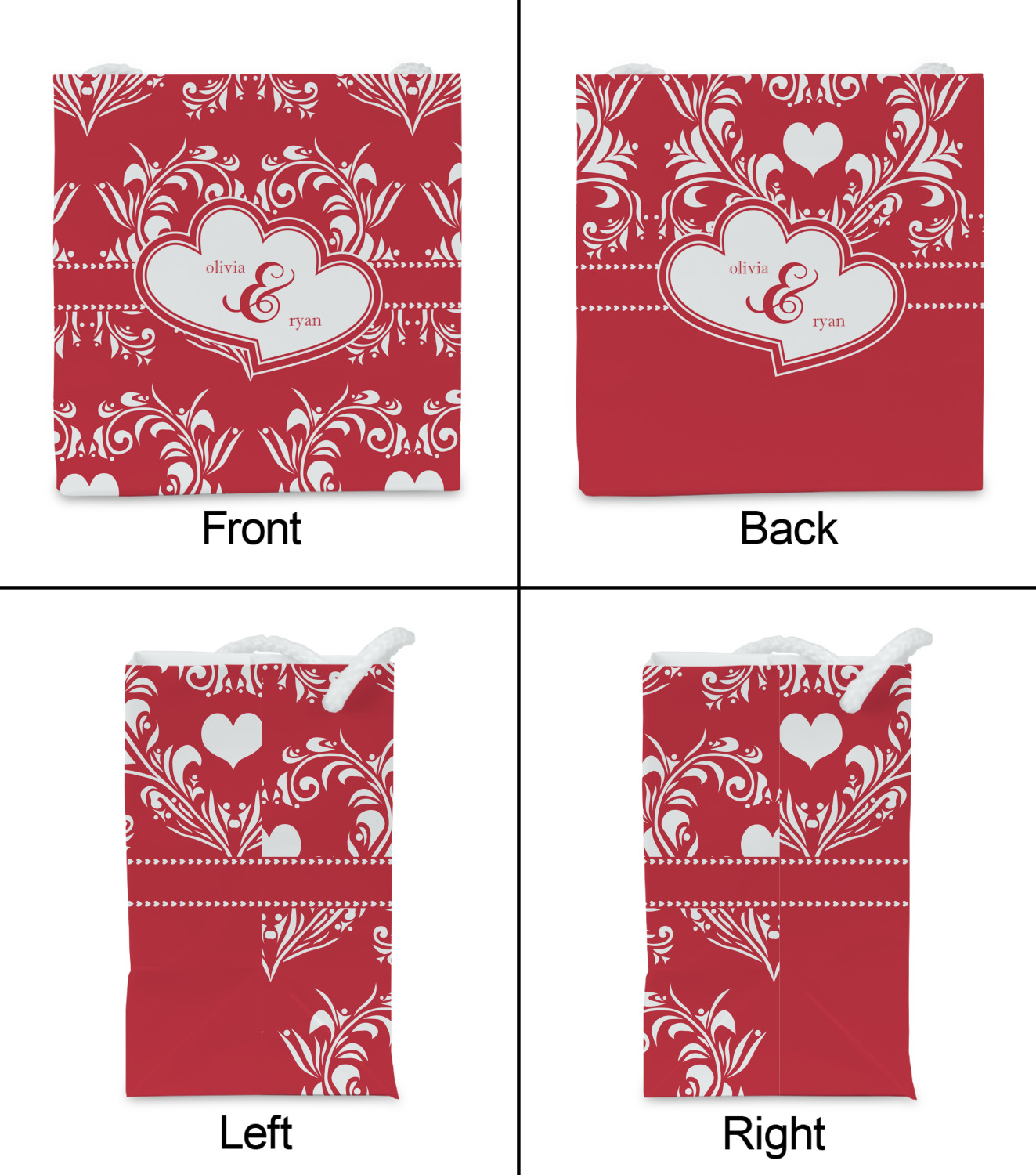 Two toned red damask hearts fill the solid red background with nothing but love. Tiny hearts link together to form a ribbon than anchor the two linking heart label. Personalize with two names to complete this love inspired damask design.