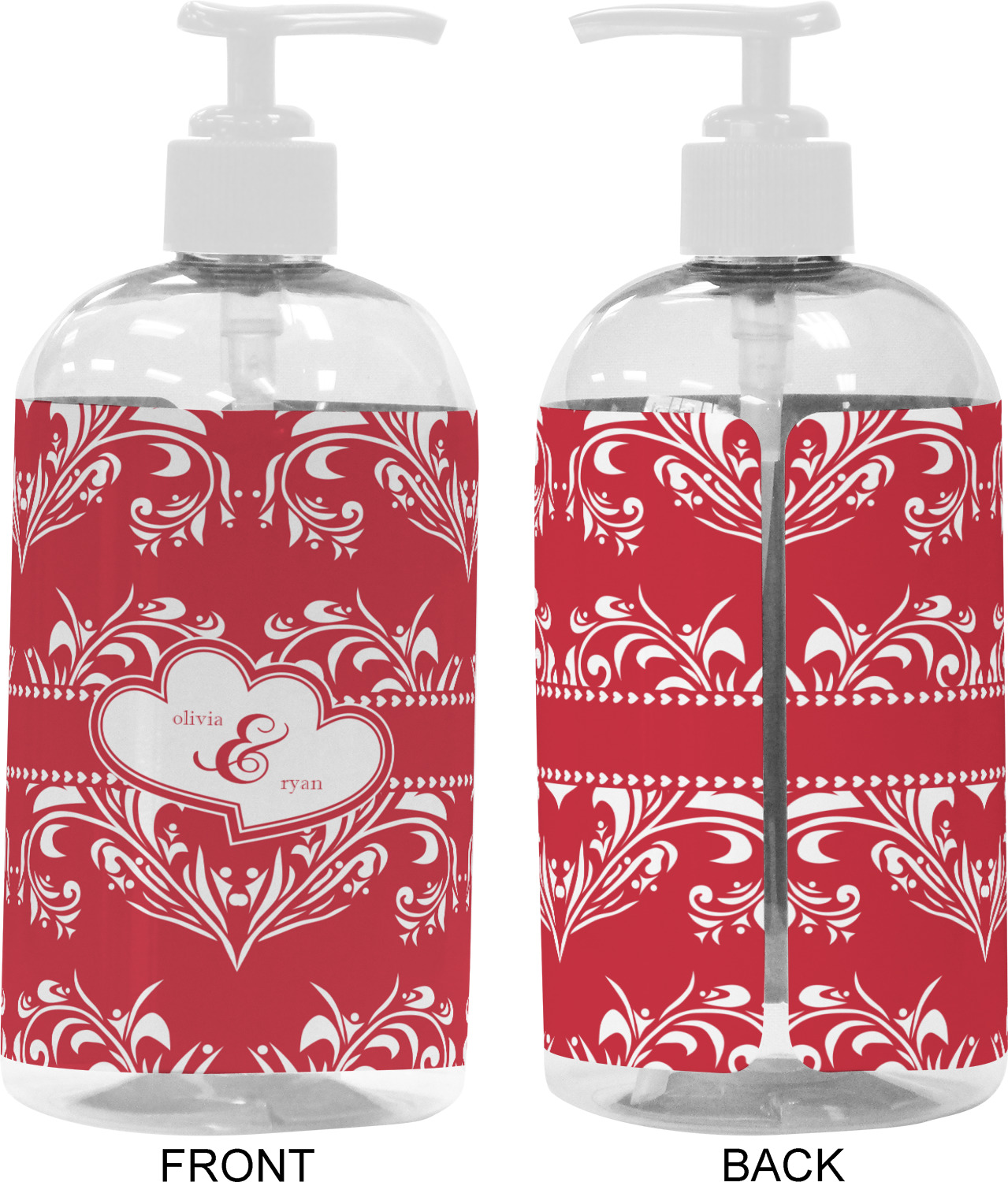 Two toned red damask hearts fill the solid red background with nothing but love. Tiny hearts link together to form a ribbon than anchor the two linking heart label. Personalize with two names to complete this love inspired damask design.