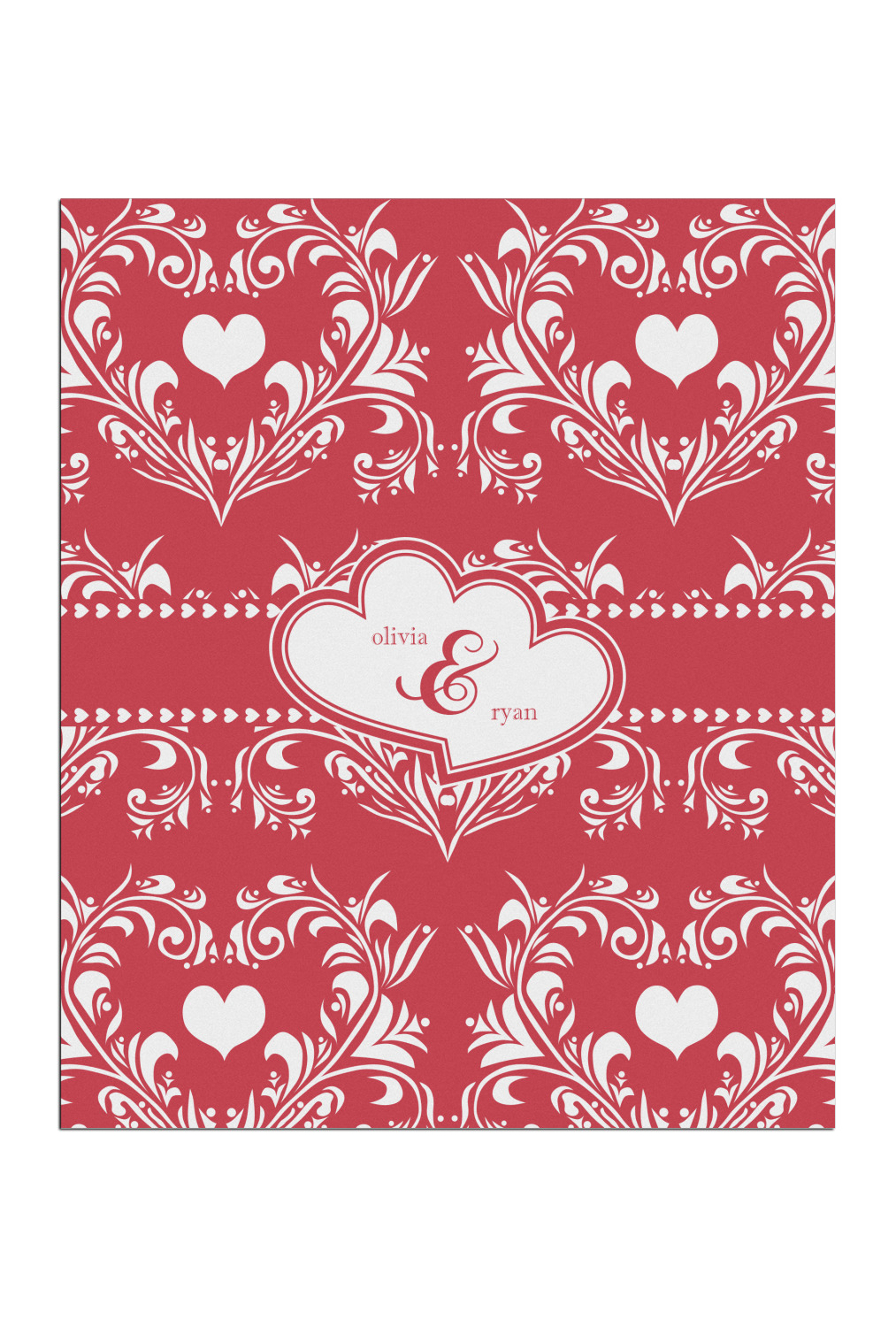 Two toned red damask hearts fill the solid red background with nothing but love. Tiny hearts link together to form a ribbon than anchor the two linking heart label. Personalize with two names to complete this love inspired damask design.