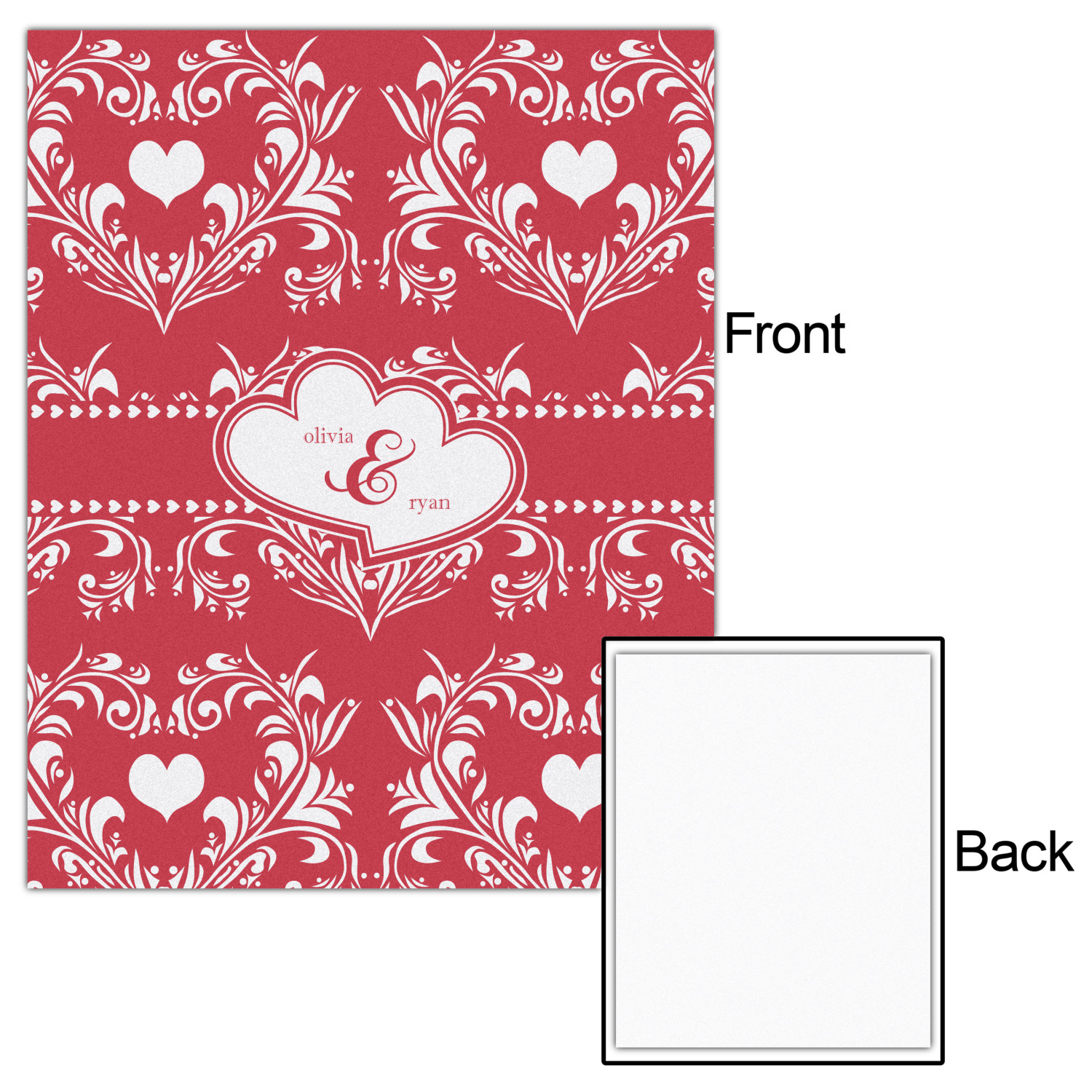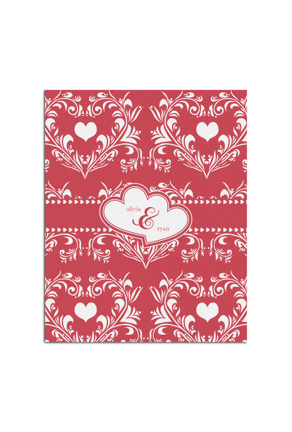 Two toned red damask hearts fill the solid red background with nothing but love. Tiny hearts link together to form a ribbon than anchor the two linking heart label. Personalize with two names to complete this love inspired damask design.