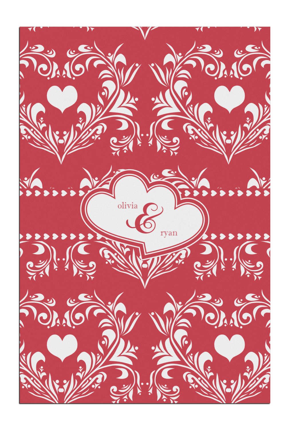 Two toned red damask hearts fill the solid red background with nothing but love. Tiny hearts link together to form a ribbon than anchor the two linking heart label. Personalize with two names to complete this love inspired damask design.