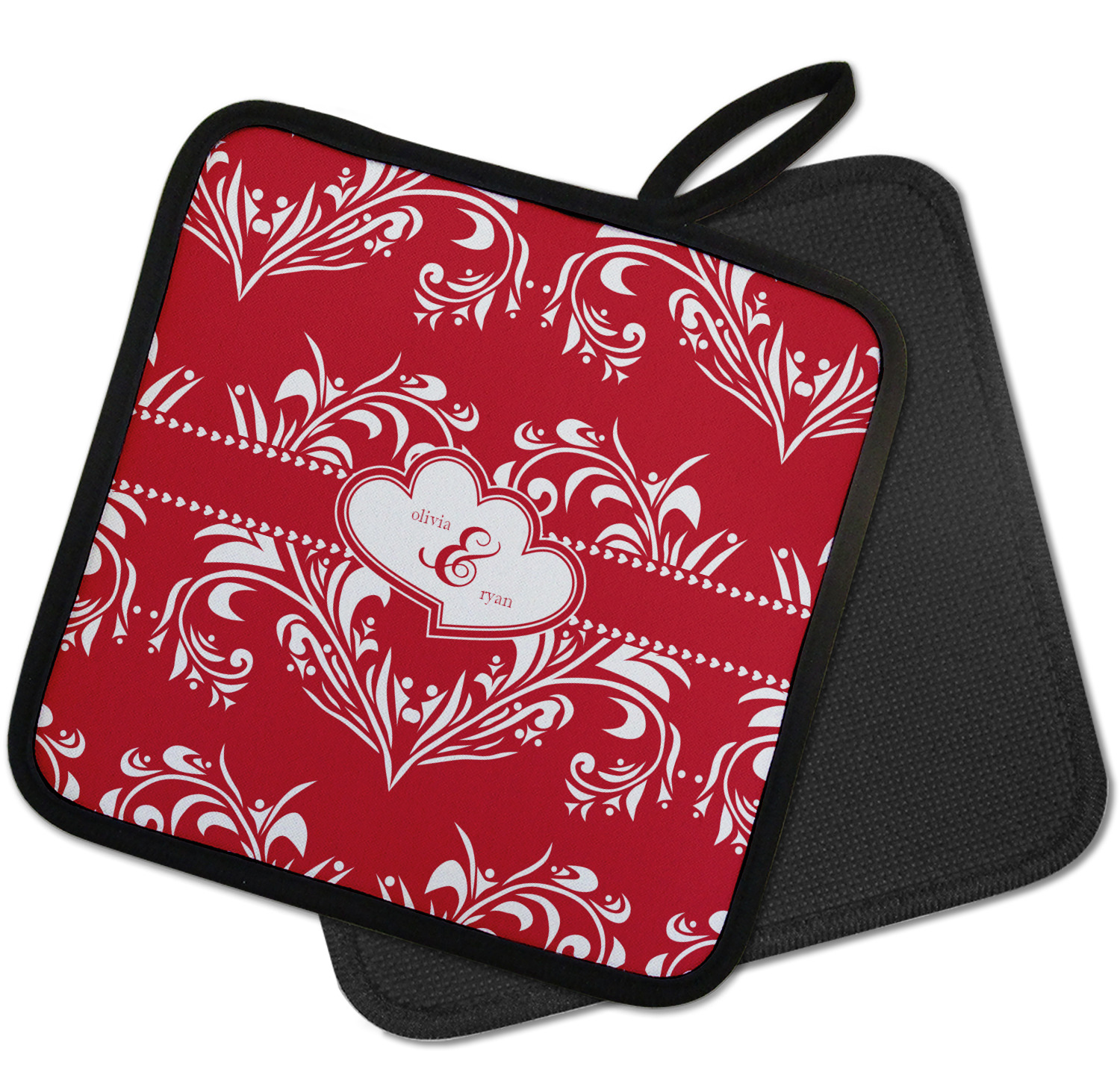 Our personalized pot holders feature a neoprene front that displays your personalization in vibrant colors. The backing of the hot pot holder is rubberized; the textured backing allows you to have a great grip when using this custom pot holder. The two materials are joined with a sleek, black trim, and the holder also includes an attached loop for hanging and storage. The pot holder is approximately 8.75 inches by 8.75 inches and 0.25 inches tall, while the fabric loop is 2.5 inches long. You can purchase a kitchen pot holder by itself or as a set of 2. We also offer a set including one pot holder and one oven mitt.