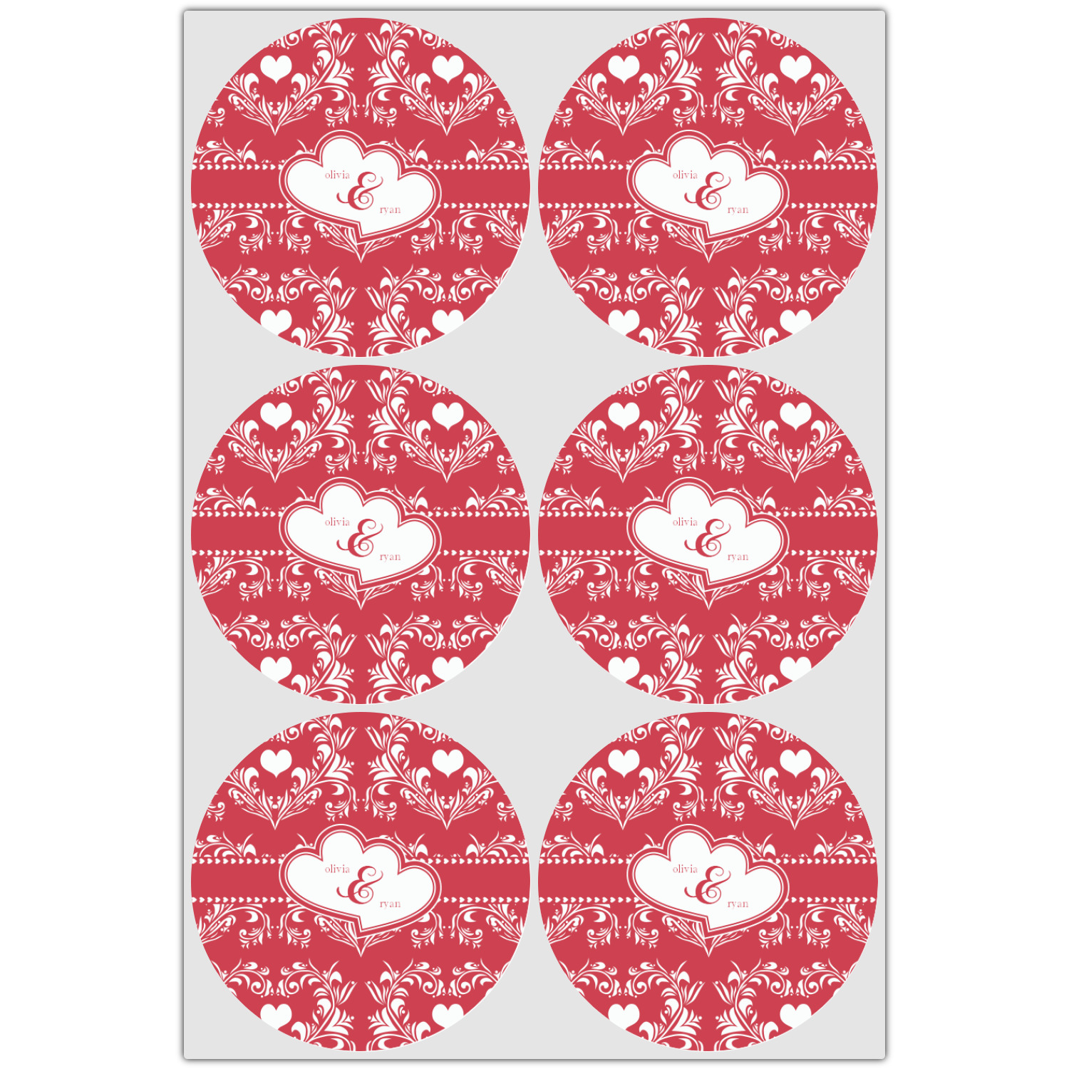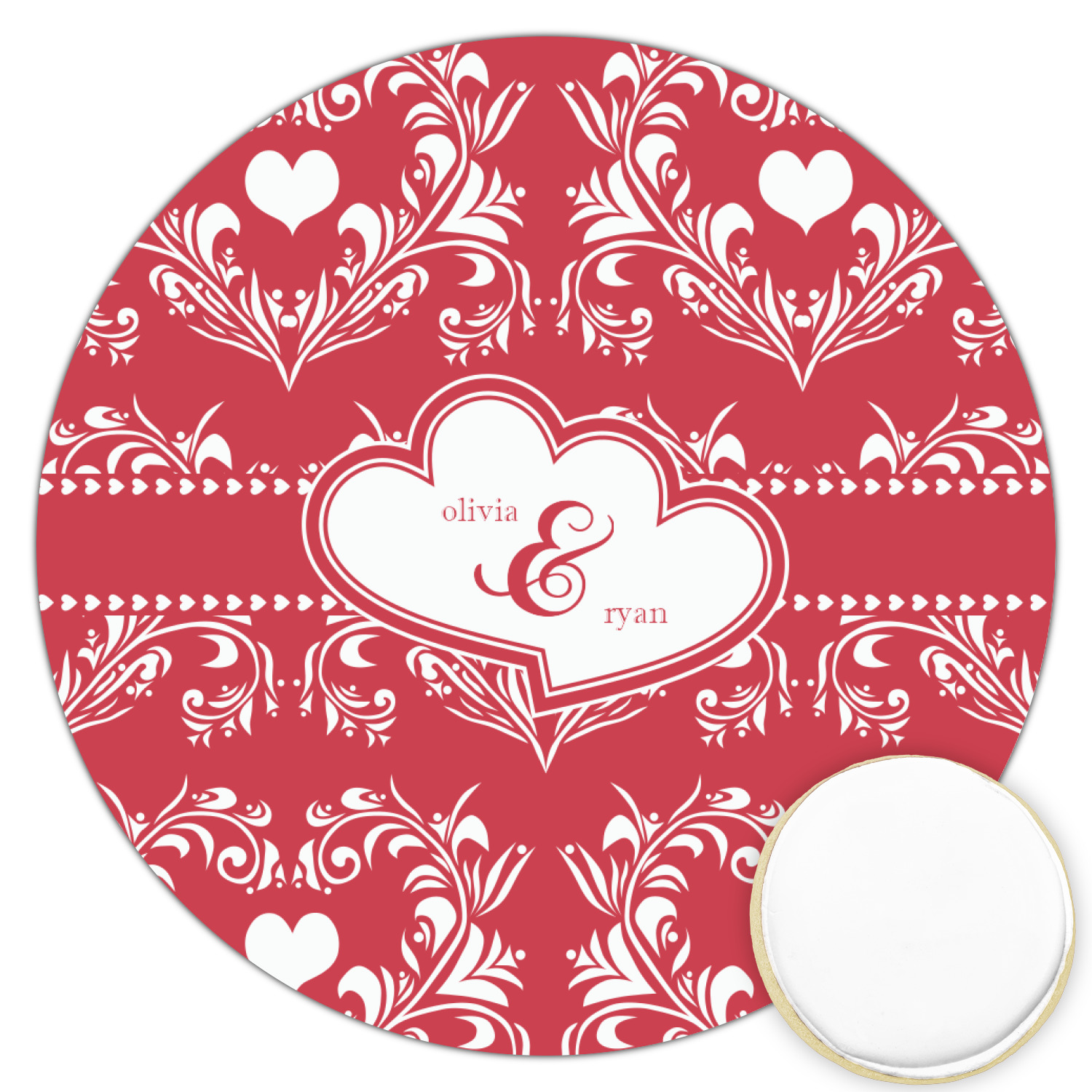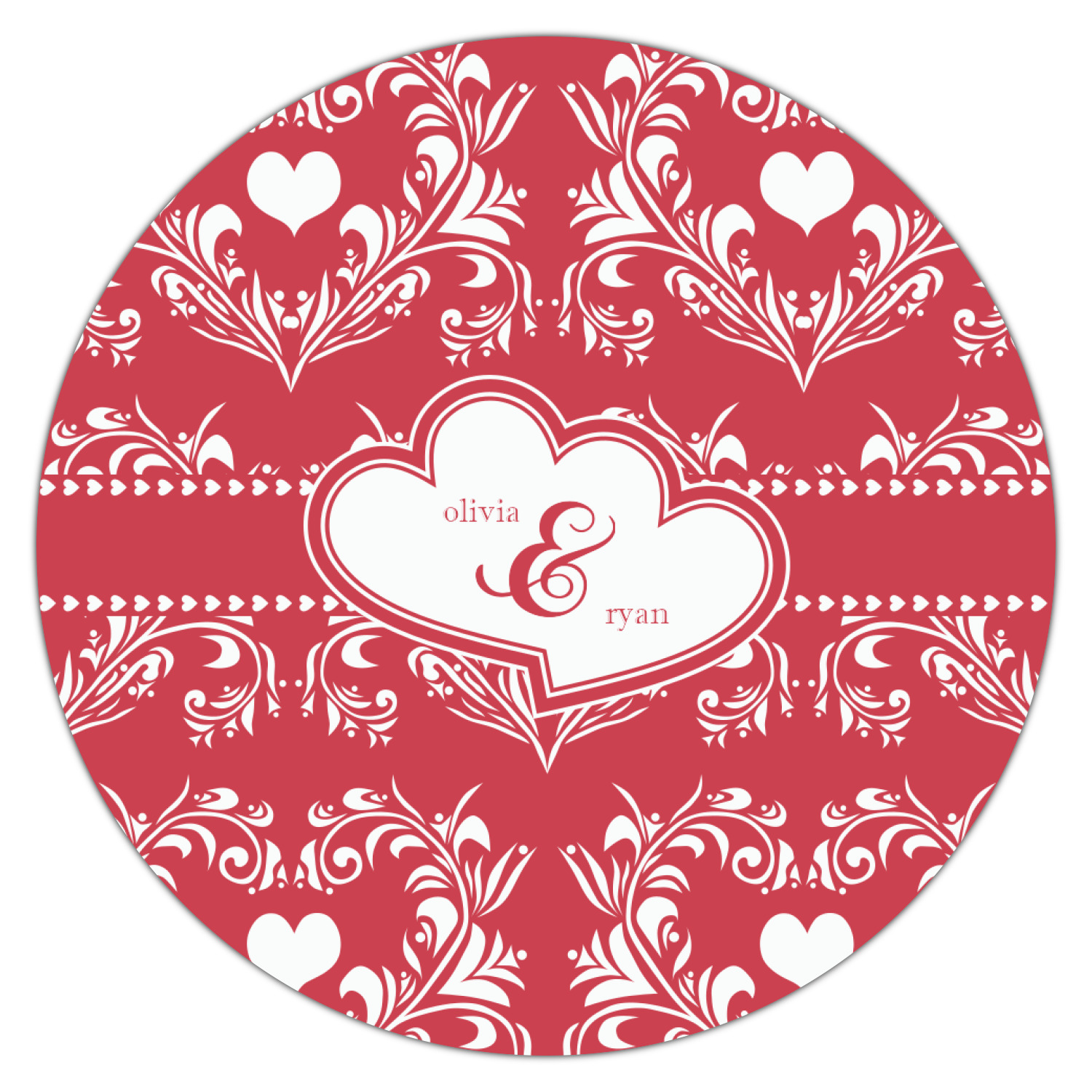 Two toned red damask hearts fill the solid red background with nothing but love. Tiny hearts link together to form a ribbon than anchor the two linking heart label. Personalize with two names to complete this love inspired damask design.
