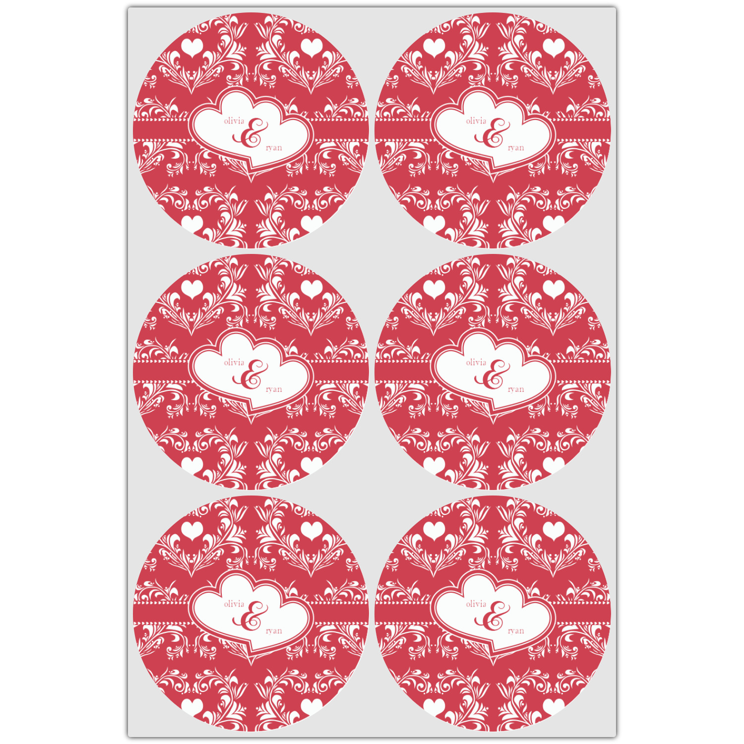 Two toned red damask hearts fill the solid red background with nothing but love. Tiny hearts link together to form a ribbon than anchor the two linking heart label. Personalize with two names to complete this love inspired damask design.