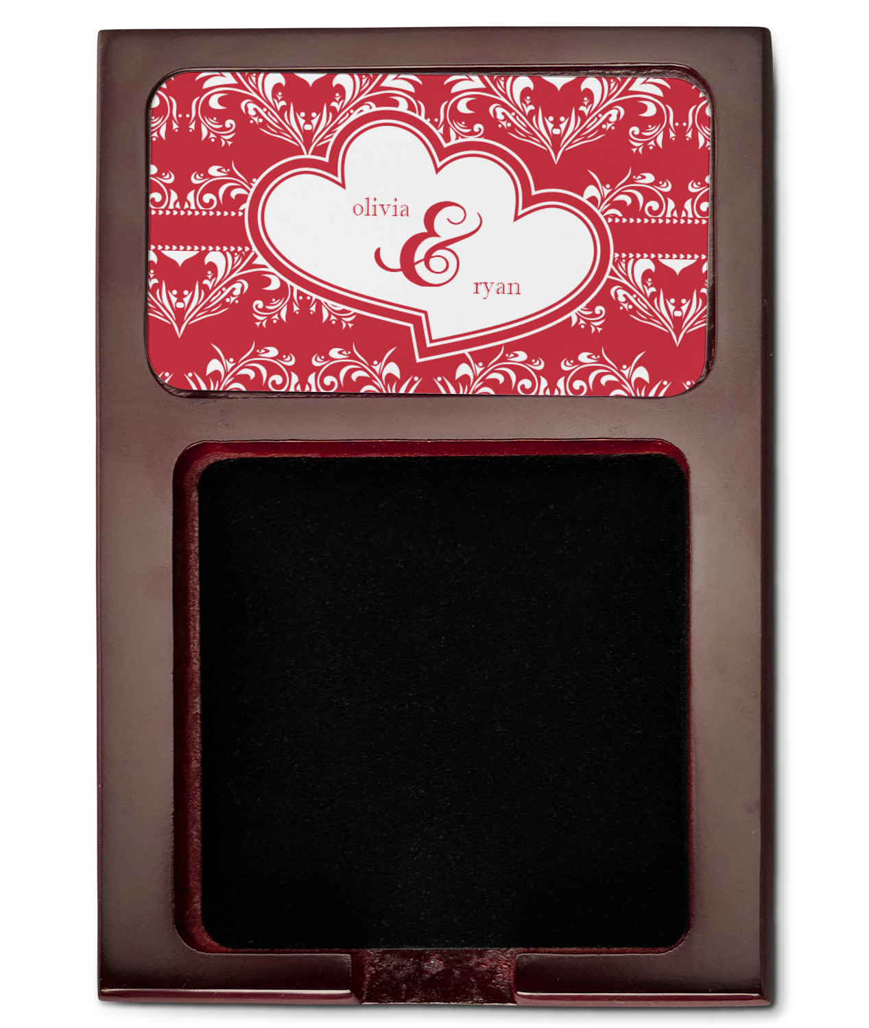 Two toned red damask hearts fill the solid red background with nothing but love. Tiny hearts link together to form a ribbon than anchor the two linking heart label. Personalize with two names to complete this love inspired damask design.