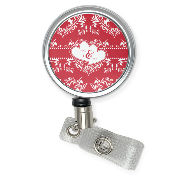 Two toned red damask hearts fill the solid red background with nothing but love. Tiny hearts link together to form a ribbon than anchor the two linking heart label. Personalize with two names to complete this love inspired damask design.