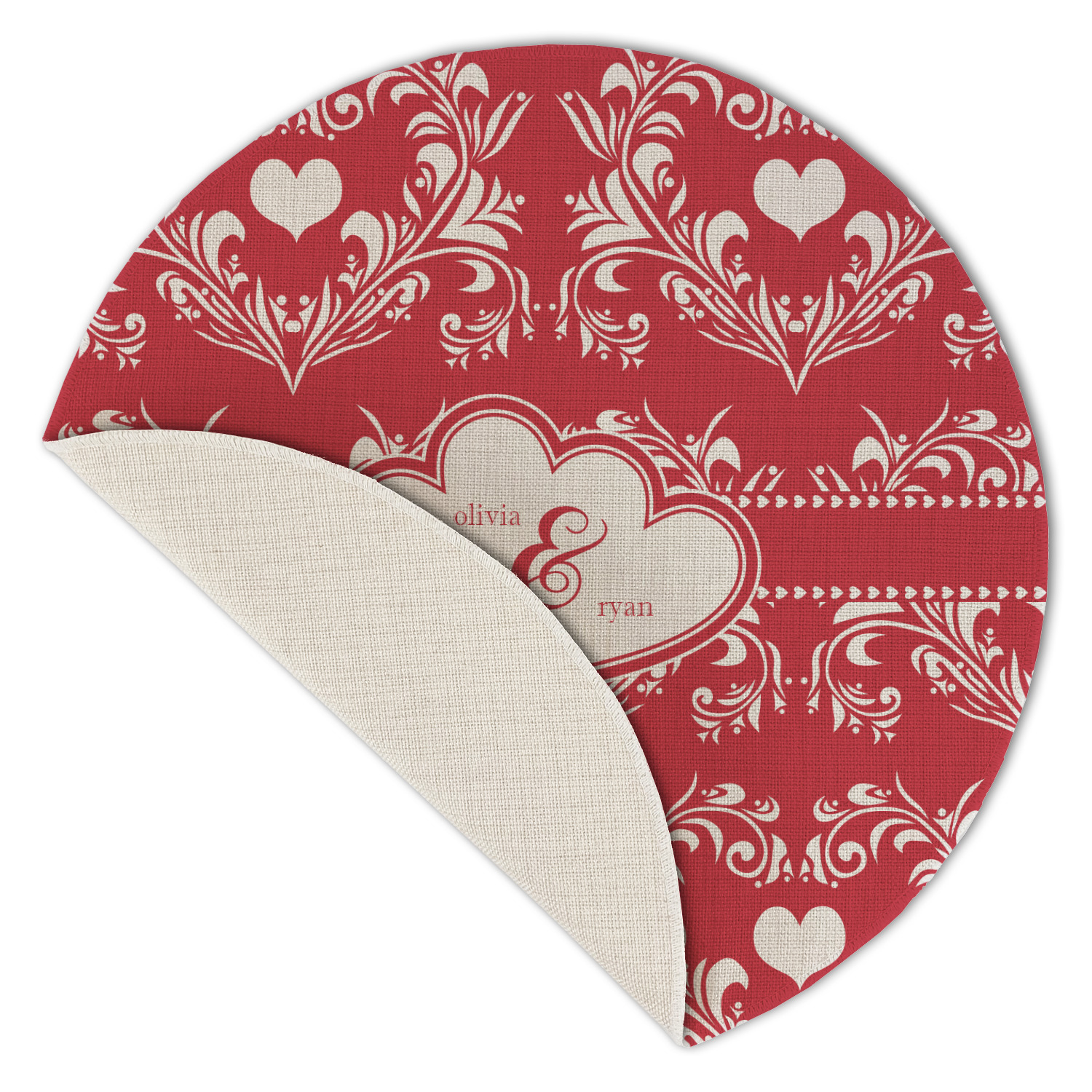 Two toned red damask hearts fill the solid red background with nothing but love. Tiny hearts link together to form a ribbon than anchor the two linking heart label. Personalize with two names to complete this love inspired damask design.