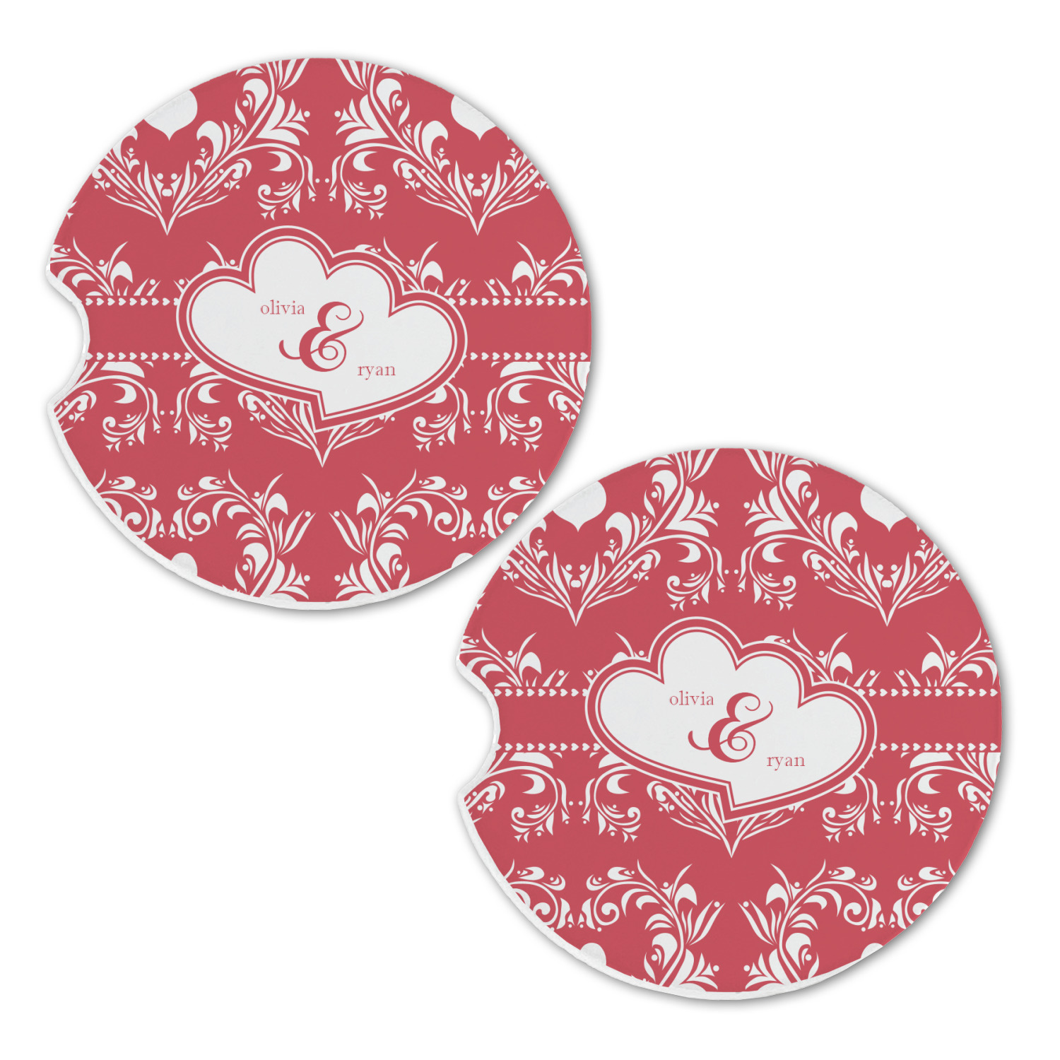 Two toned red damask hearts fill the solid red background with nothing but love. Tiny hearts link together to form a ribbon than anchor the two linking heart label. Personalize with two names to complete this love inspired damask design.