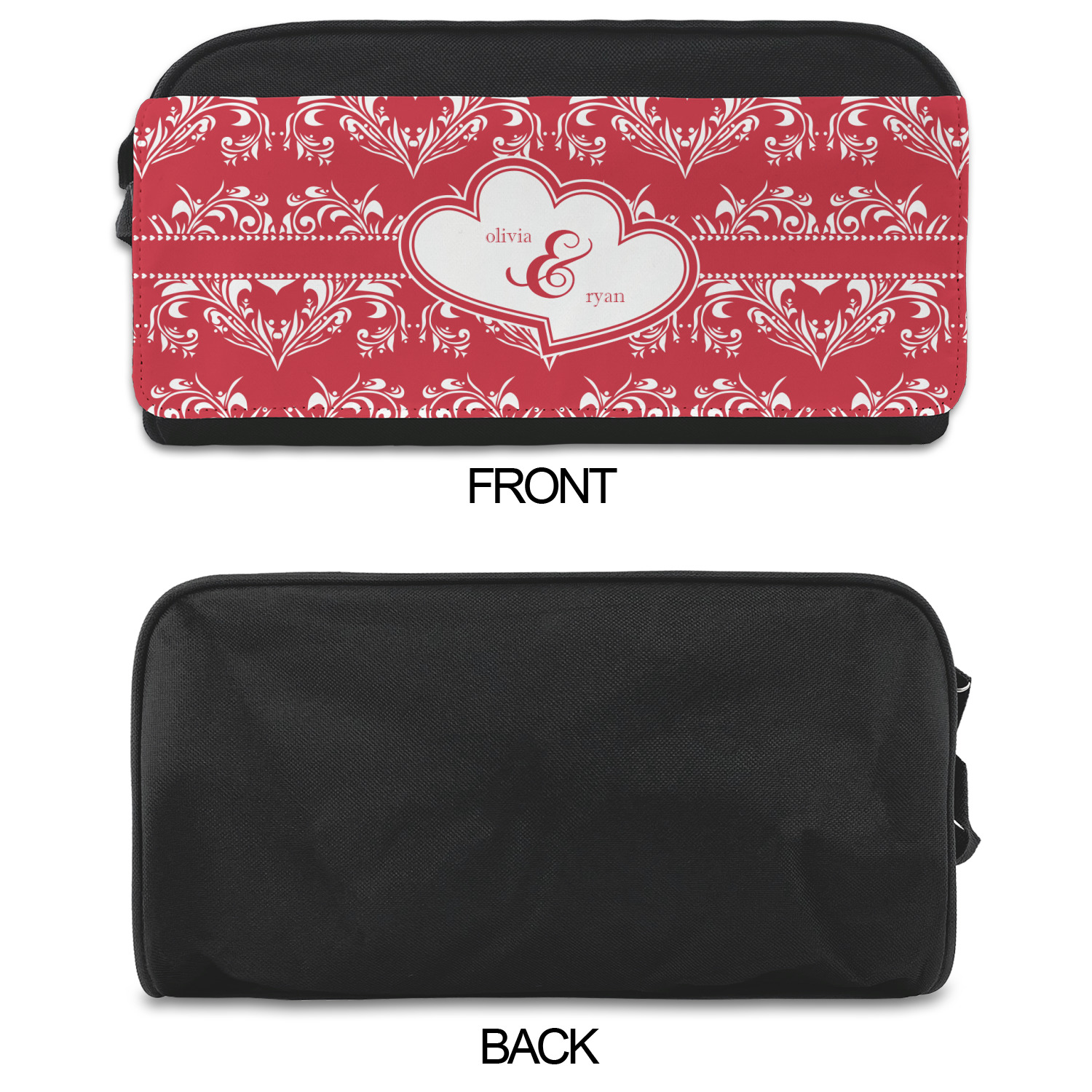 Two toned red damask hearts fill the solid red background with nothing but love. Tiny hearts link together to form a ribbon than anchor the two linking heart label. Personalize with two names to complete this love inspired damask design.