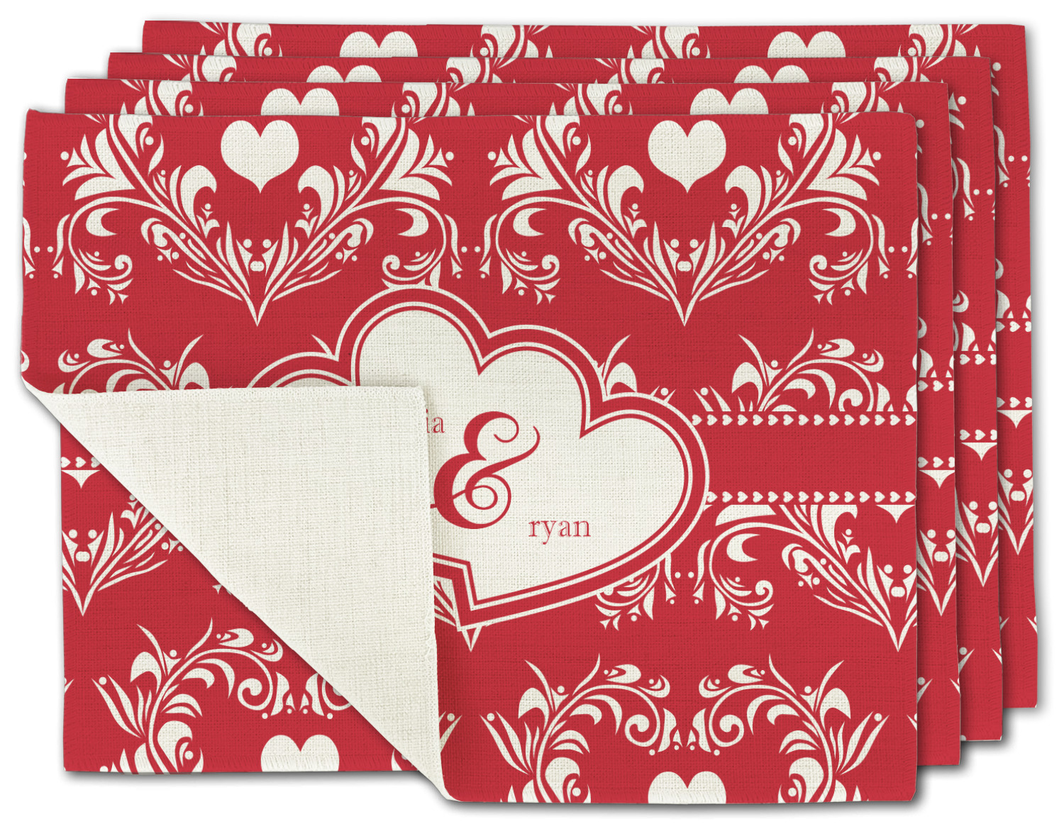 Two toned red damask hearts fill the solid red background with nothing but love. Tiny hearts link together to form a ribbon than anchor the two linking heart label. Personalize with two names to complete this love inspired damask design.