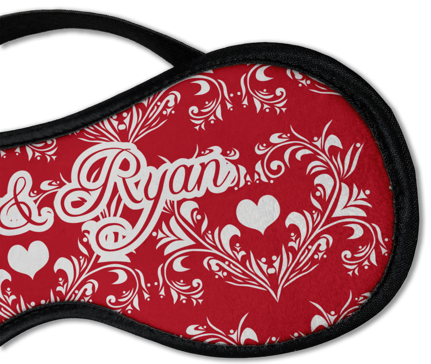 Two toned red damask hearts fill the solid red background with nothing but love. Tiny hearts link together to form a ribbon than anchor the two linking heart label. Personalize with two names to complete this love inspired damask design.