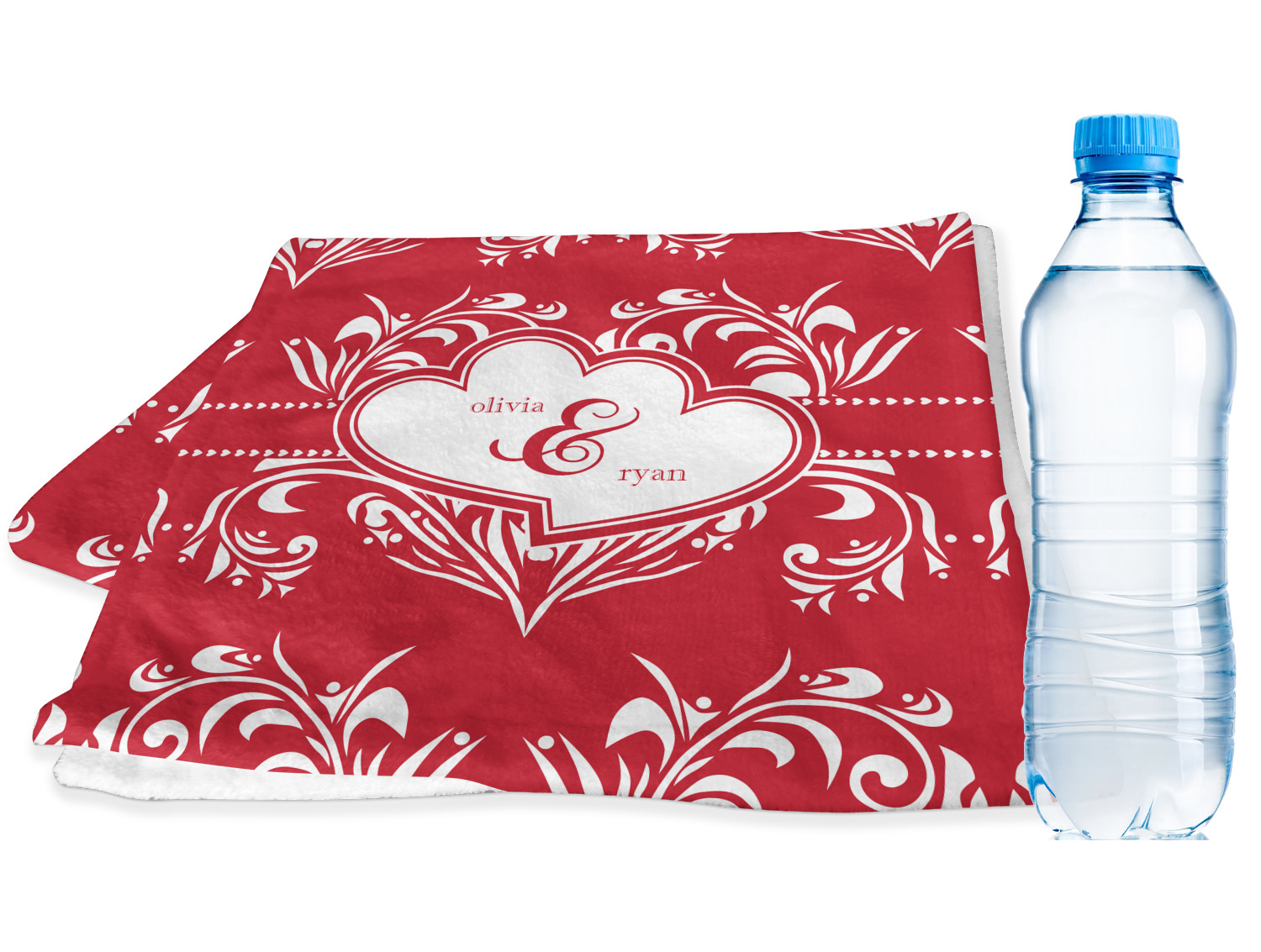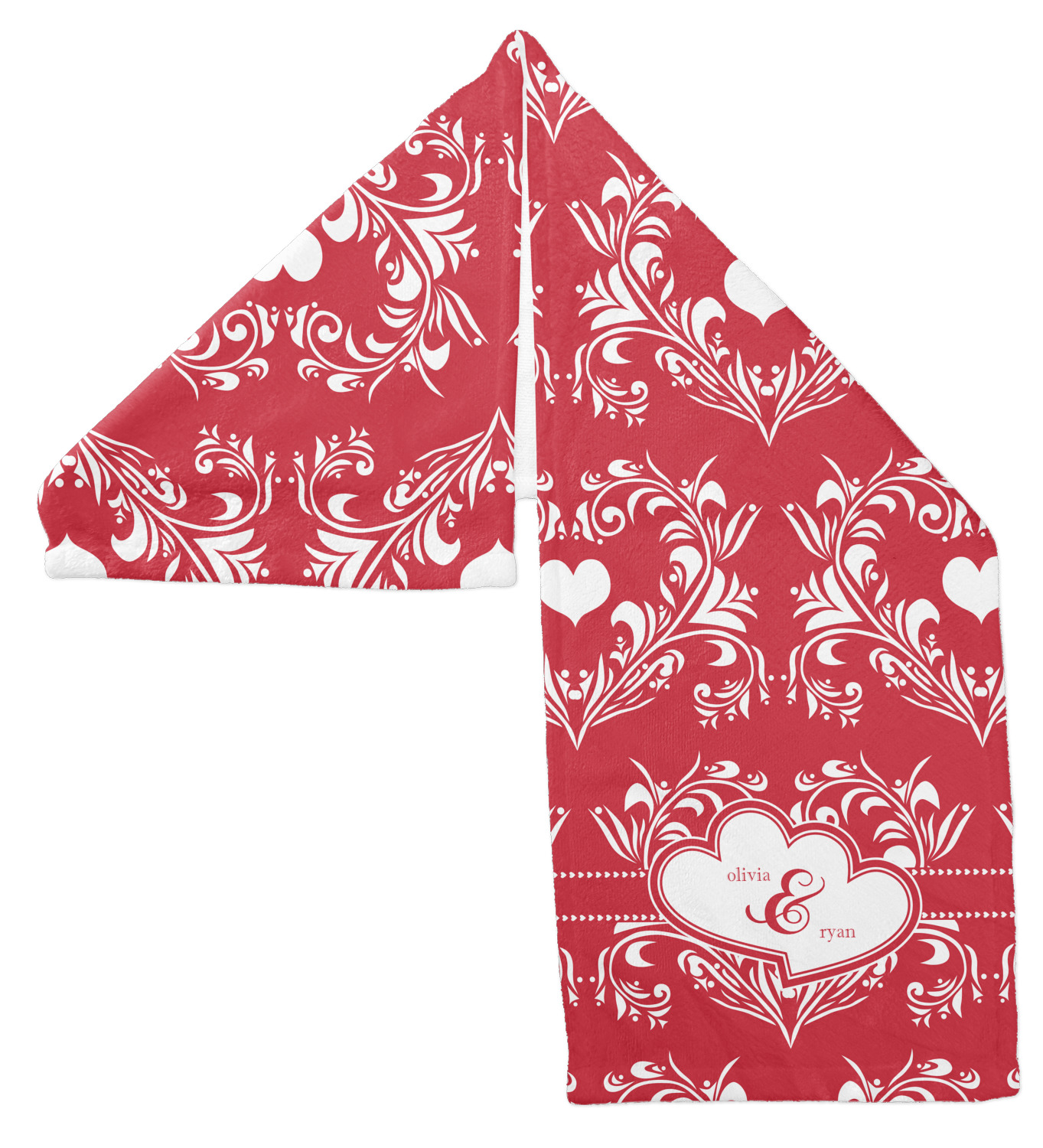 Two toned red damask hearts fill the solid red background with nothing but love. Tiny hearts link together to form a ribbon than anchor the two linking heart label. Personalize with two names to complete this love inspired damask design.