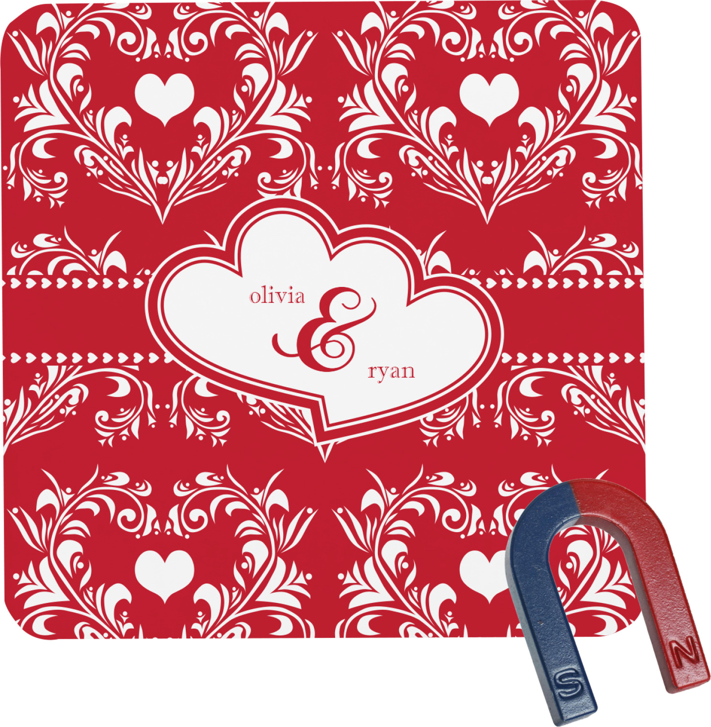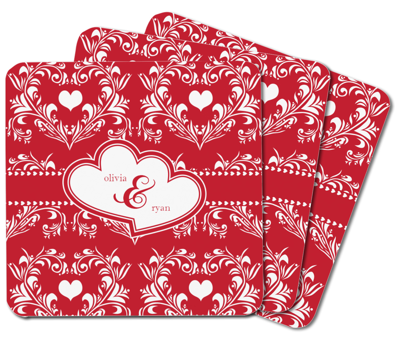 Two toned red damask hearts fill the solid red background with nothing but love. Tiny hearts link together to form a ribbon than anchor the two linking heart label. Personalize with two names to complete this love inspired damask design.