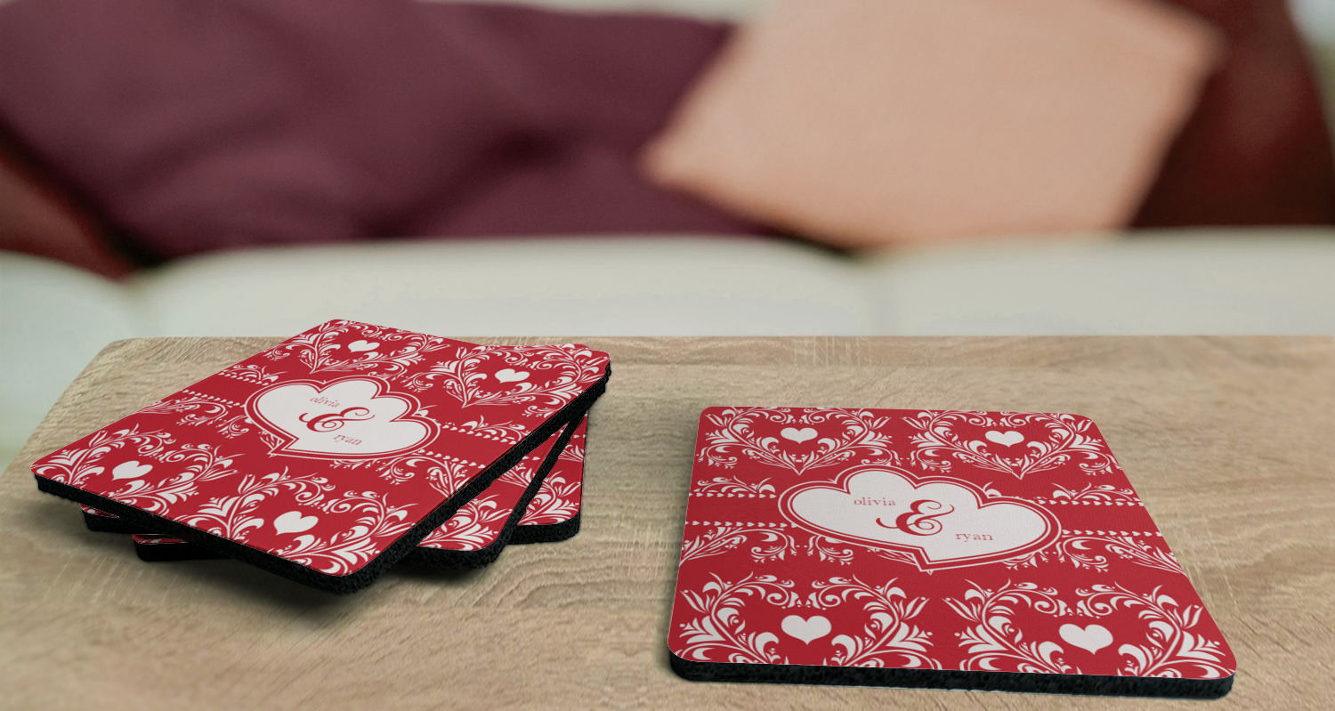 These drink coasters have a smooth, polyester top and a textured, rubber backing on its bottom. The non-slip rubber backing underneath works to keep any spills at bay. At 4 by 4 by 0.25 inches thick, these custom coasters are a suitable size for most drinkware. Your personalization is displayed atop the face of the cup coaster. We sell these rubber coasters in two different shapes: square and round. You can buy each shape as singulars or as a set of 4.