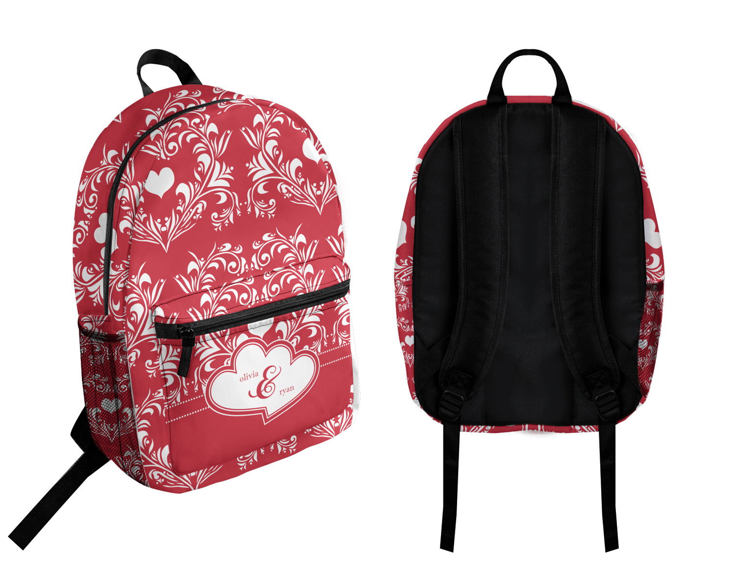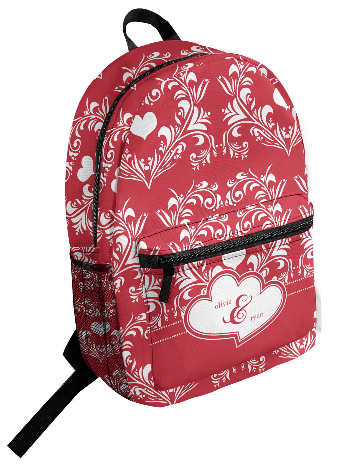 Two toned red damask hearts fill the solid red background with nothing but love. Tiny hearts link together to form a ribbon than anchor the two linking heart label. Personalize with two names to complete this love inspired damask design.