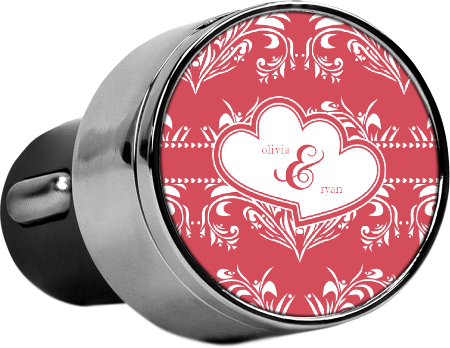 This car charger adapter converts your cars bland cigarette lighter into a decorative, personalized, and operational USB charging port. Made of solid, silver-plated metal, these chargers feature a flip-open lid that both displays your customized design and conceals two USB ports. The metal lid of the USB car charger adapter is 1.5" in diameter and seals due to a small, ingrained magnet on both the charger and its lid. The cigarette lighter insert, itself, is colored black.