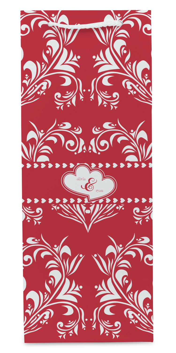 Two toned red damask hearts fill the solid red background with nothing but love. Tiny hearts link together to form a ribbon than anchor the two linking heart label. Personalize with two names to complete this love inspired damask design.