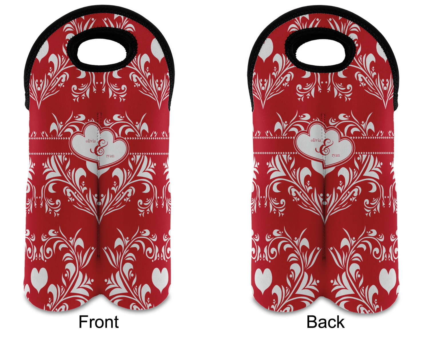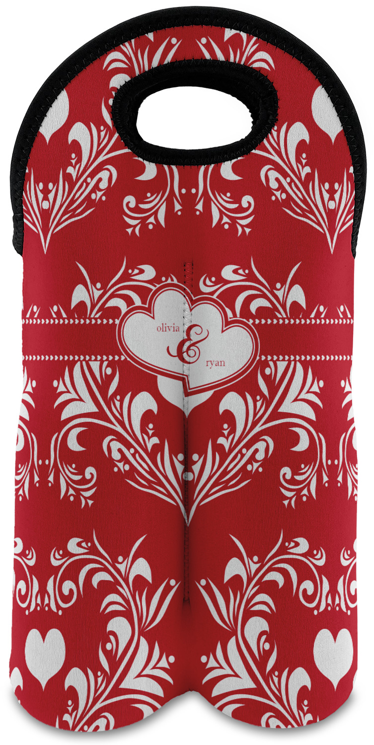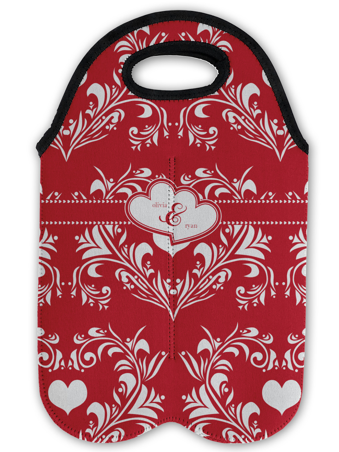 Two toned red damask hearts fill the solid red background with nothing but love. Tiny hearts link together to form a ribbon than anchor the two linking heart label. Personalize with two names to complete this love inspired damask design.