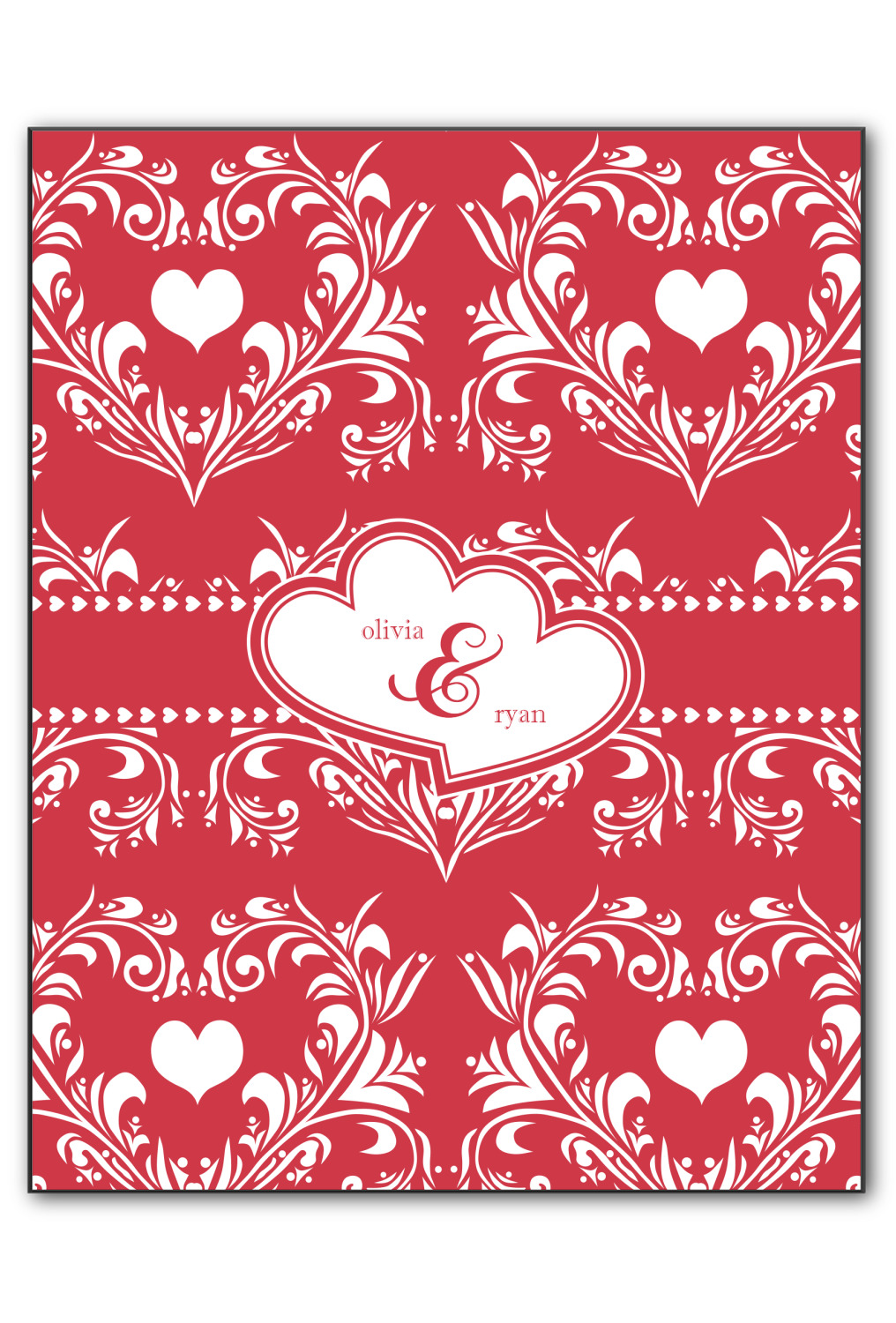 Two toned red damask hearts fill the solid red background with nothing but love. Tiny hearts link together to form a ribbon than anchor the two linking heart label. Personalize with two names to complete this love inspired damask design.