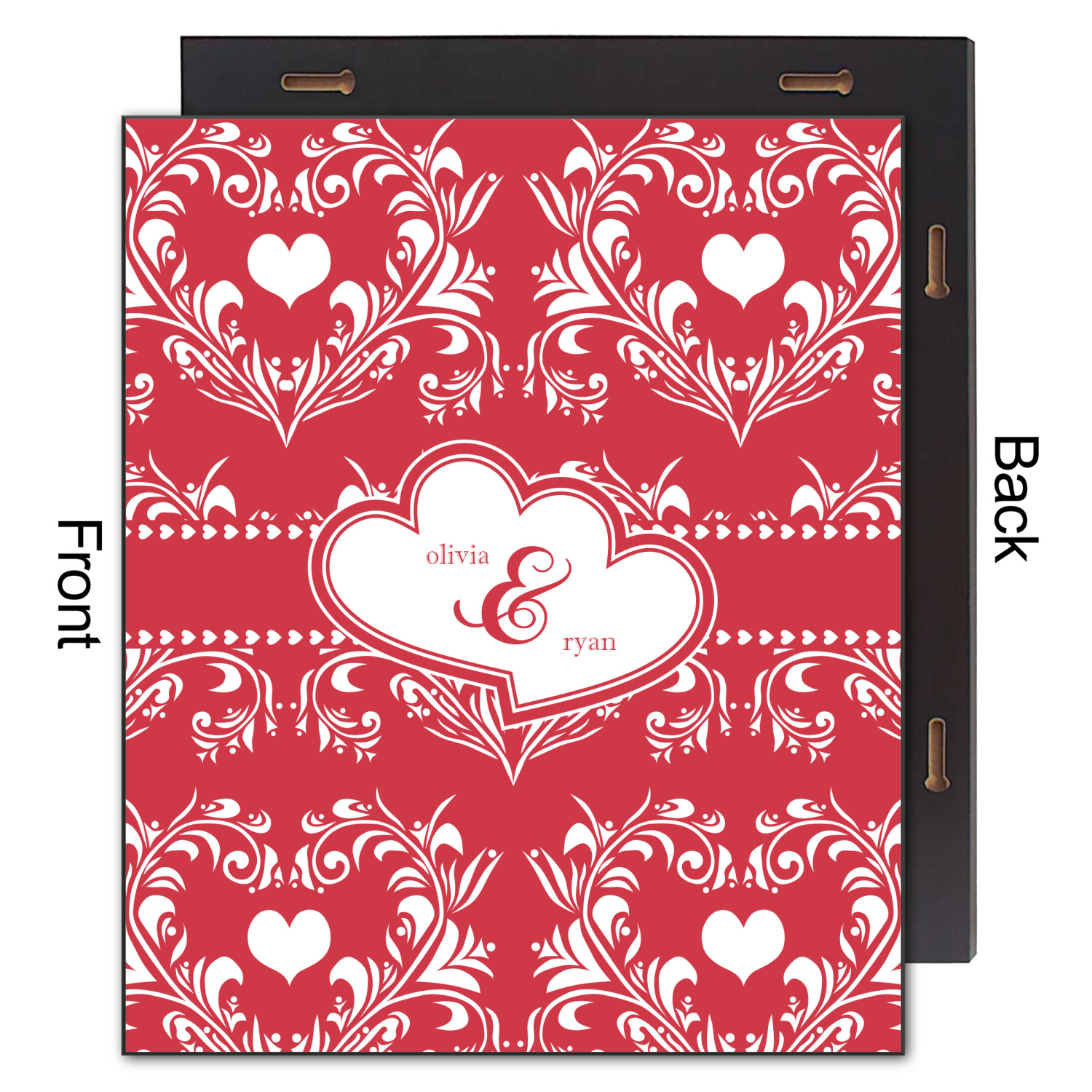 Two toned red damask hearts fill the solid red background with nothing but love. Tiny hearts link together to form a ribbon than anchor the two linking heart label. Personalize with two names to complete this love inspired damask design.