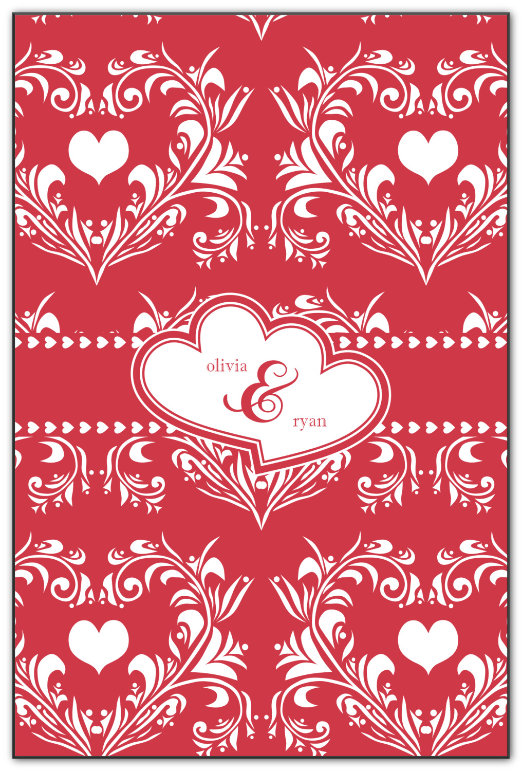 Two toned red damask hearts fill the solid red background with nothing but love. Tiny hearts link together to form a ribbon than anchor the two linking heart label. Personalize with two names to complete this love inspired damask design.