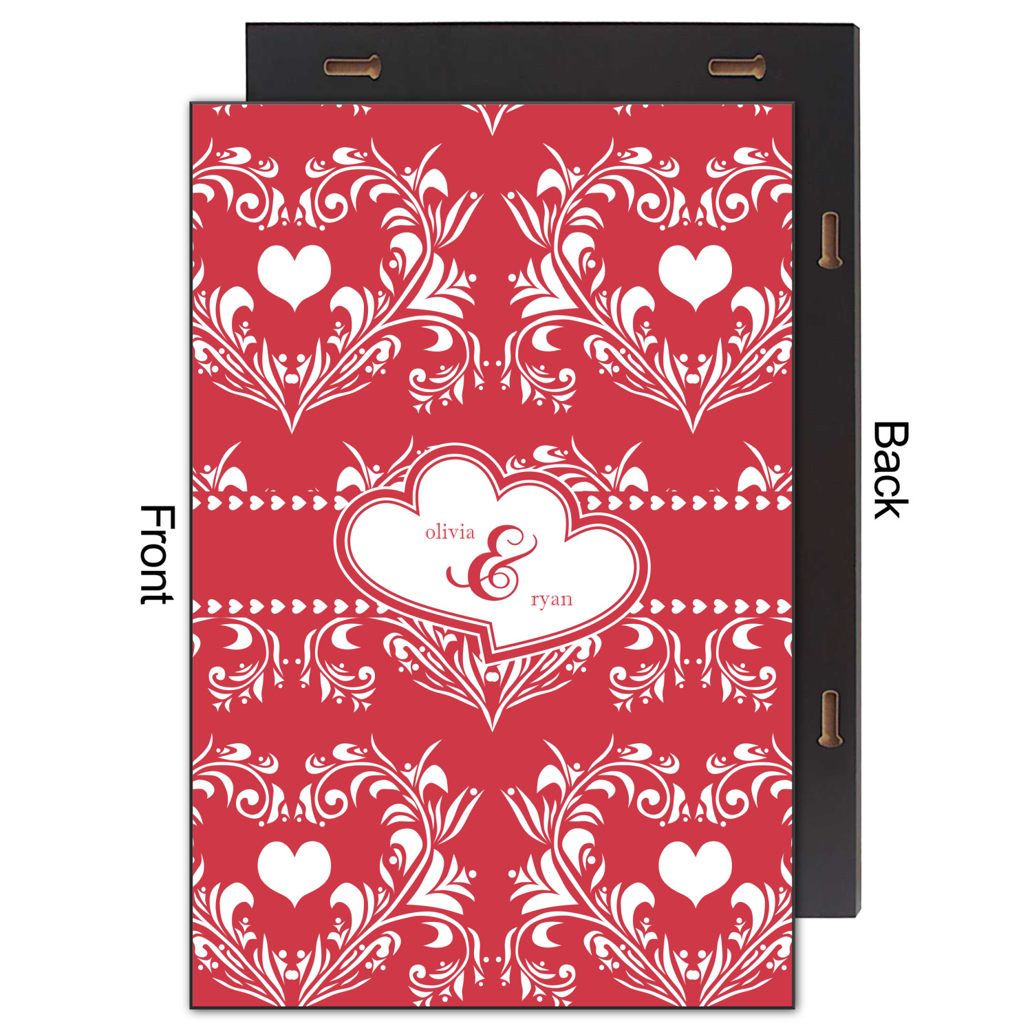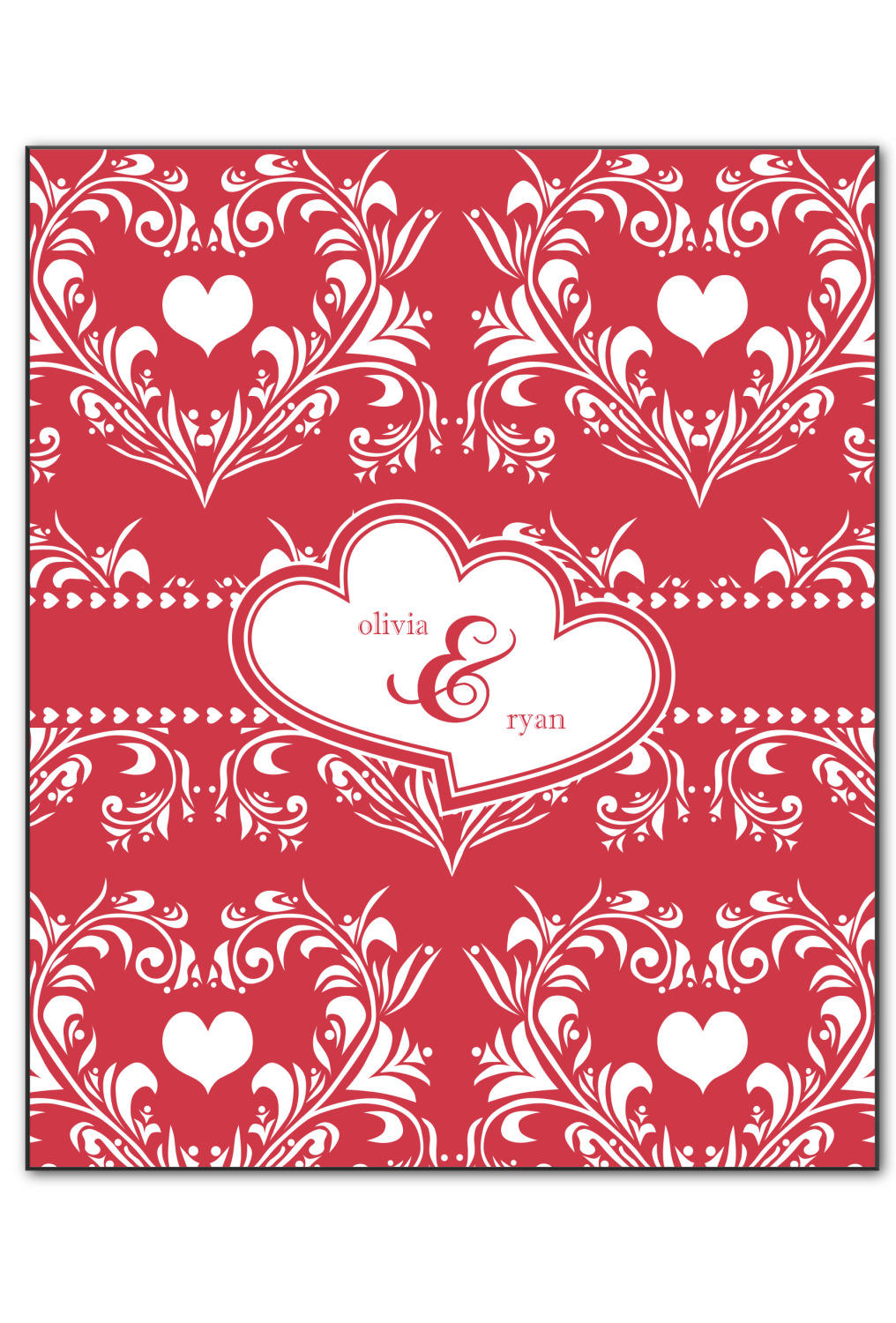 Two toned red damask hearts fill the solid red background with nothing but love. Tiny hearts link together to form a ribbon than anchor the two linking heart label. Personalize with two names to complete this love inspired damask design.