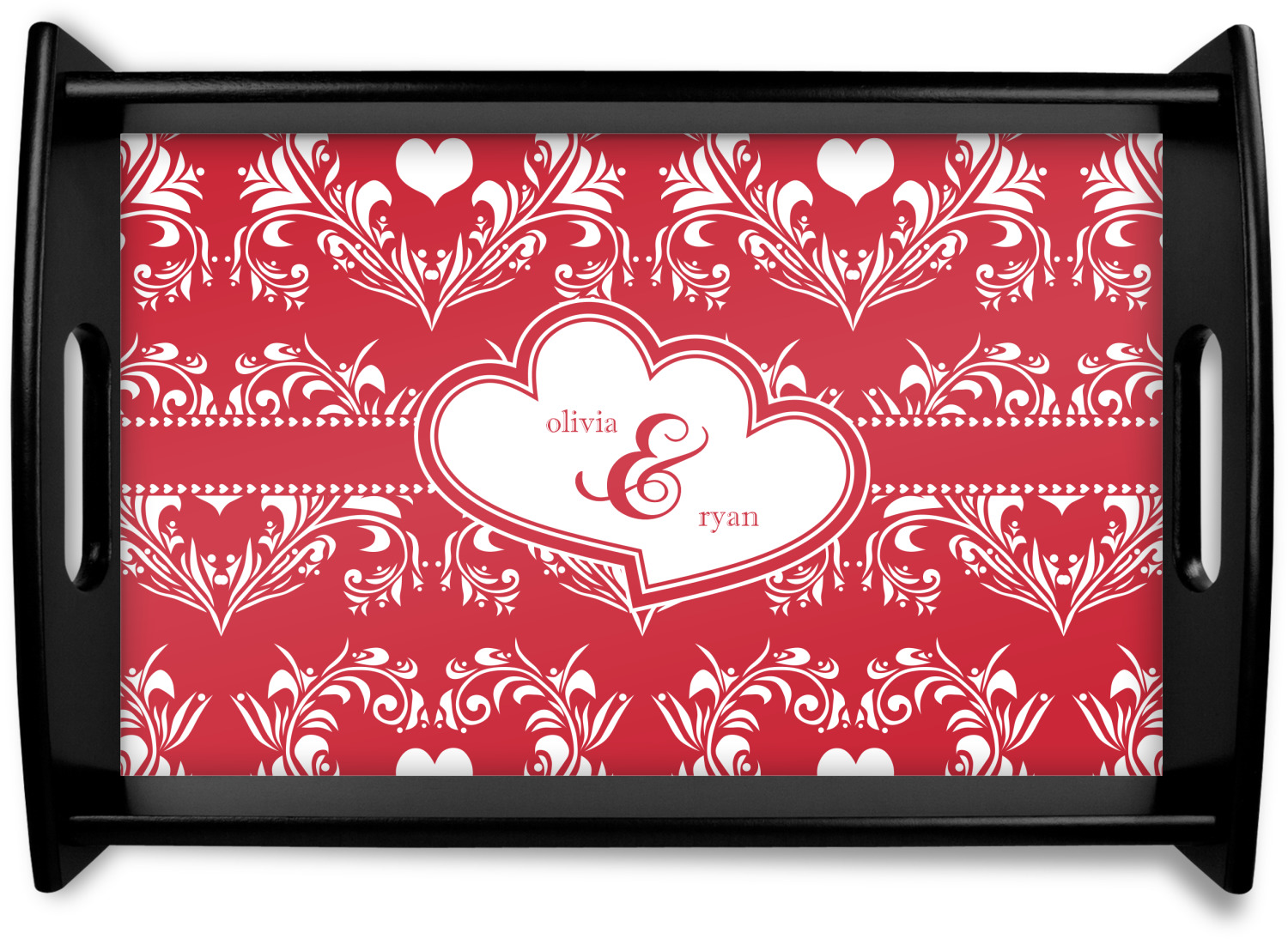 Two toned red damask hearts fill the solid red background with nothing but love. Tiny hearts link together to form a ribbon than anchor the two linking heart label. Personalize with two names to complete this love inspired damask design.