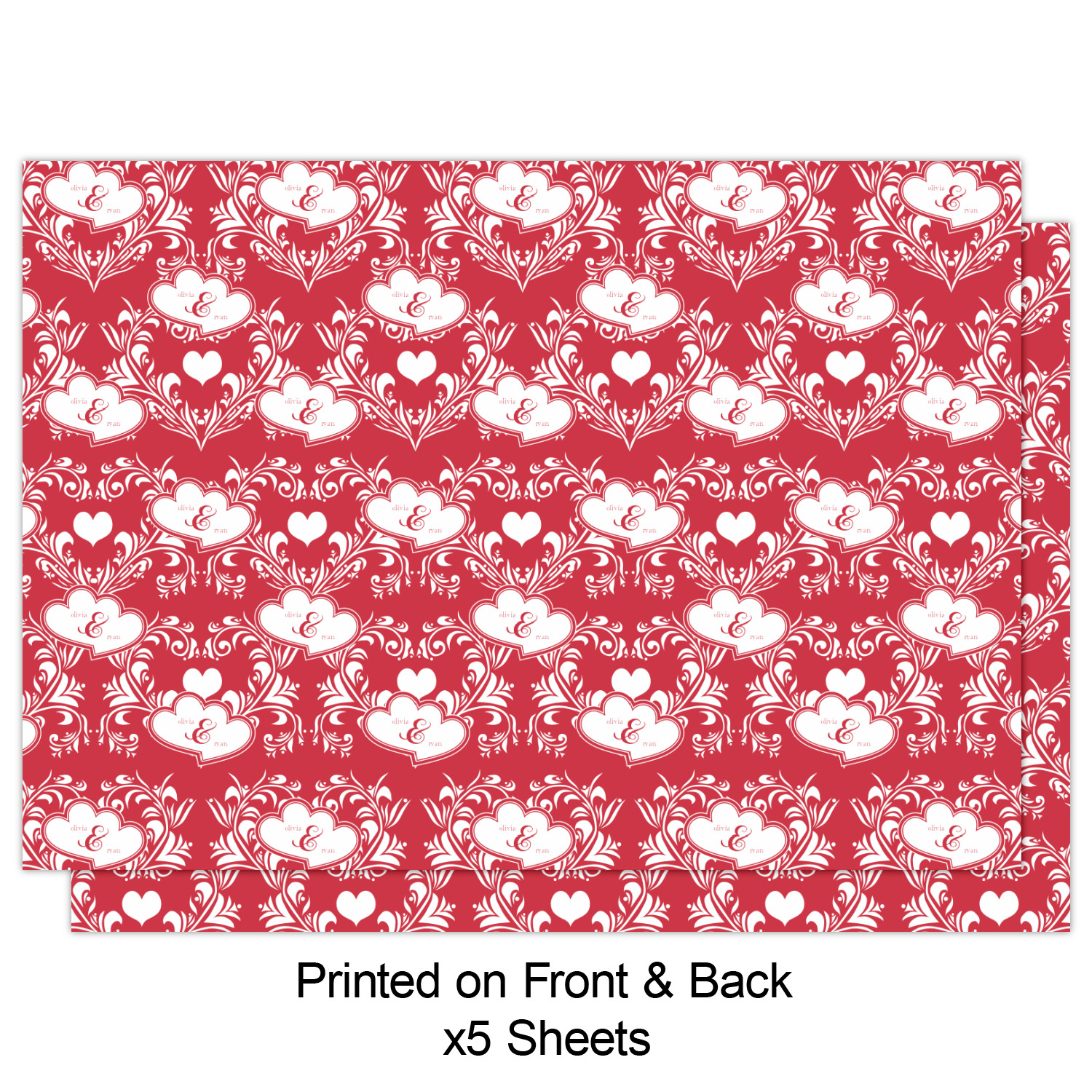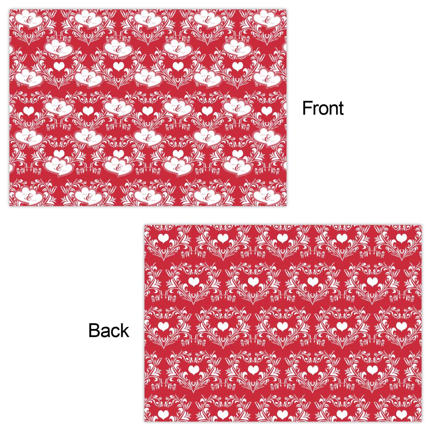Two toned red damask hearts fill the solid red background with nothing but love. Tiny hearts link together to form a ribbon than anchor the two linking heart label. Personalize with two names to complete this love inspired damask design.