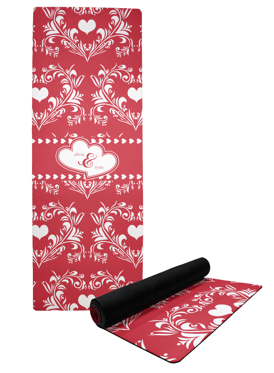 Two toned red damask hearts fill the solid red background with nothing but love. Tiny hearts link together to form a ribbon than anchor the two linking heart label. Personalize with two names to complete this love inspired damask design.
