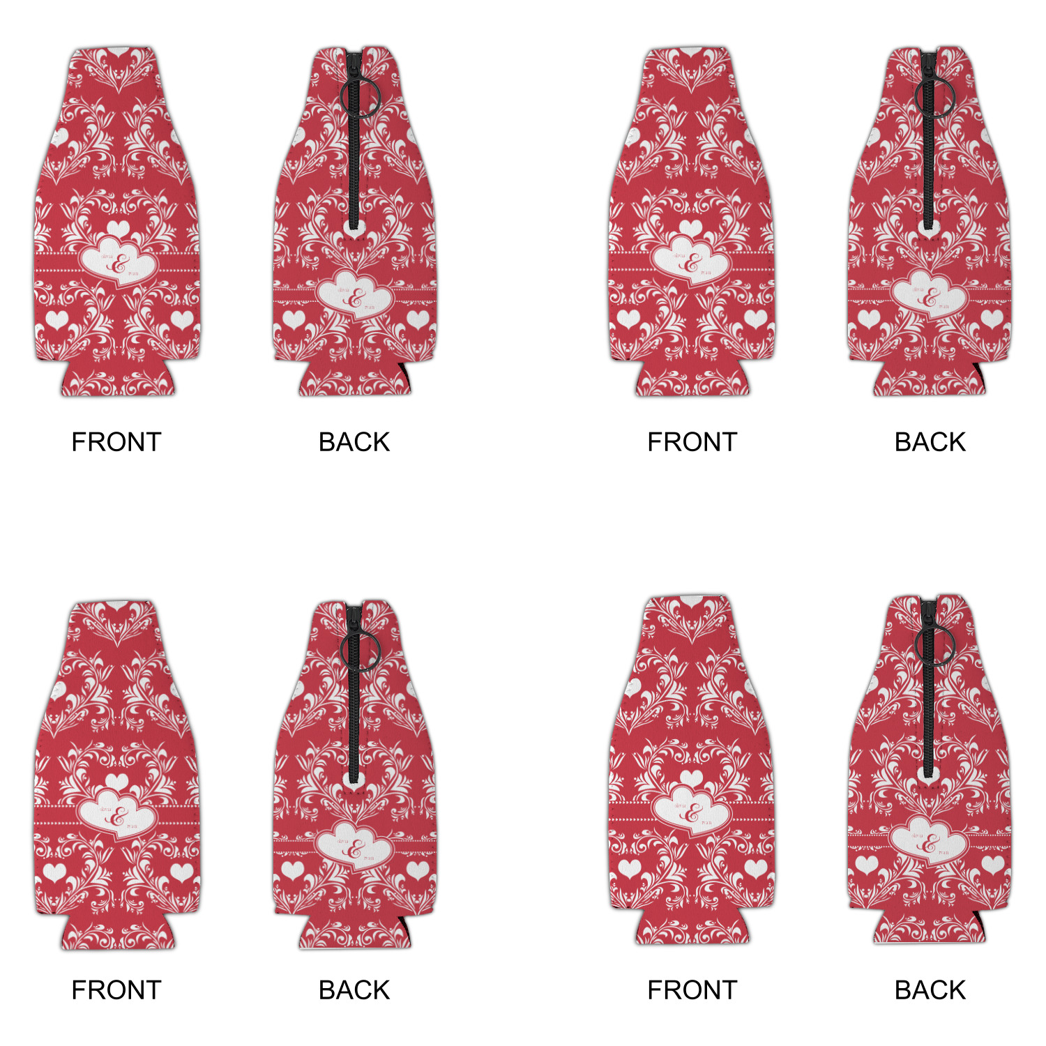 Two toned red damask hearts fill the solid red background with nothing but love. Tiny hearts link together to form a ribbon than anchor the two linking heart label. Personalize with two names to complete this love inspired damask design.