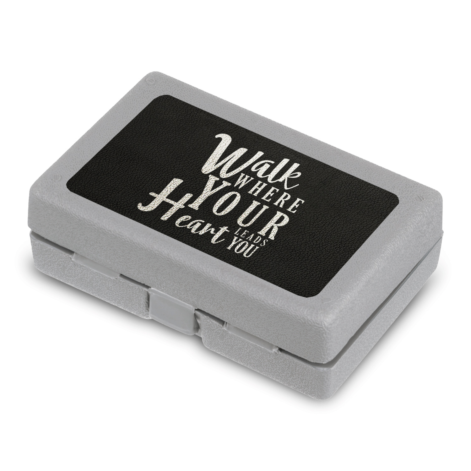 In a tri-fold hard shell case which measures 6" wide, 4" deep and 2" tall, this kit is the perfect size to keep in a desk, garage drawer, or anywhere else in the house. The snap closure keeps it securely closed to ensure the tools do not fall out. With the black faux leather on the outside engraved with your choice of personalization it will be easier to ensure it stays yours by being customized just for you!