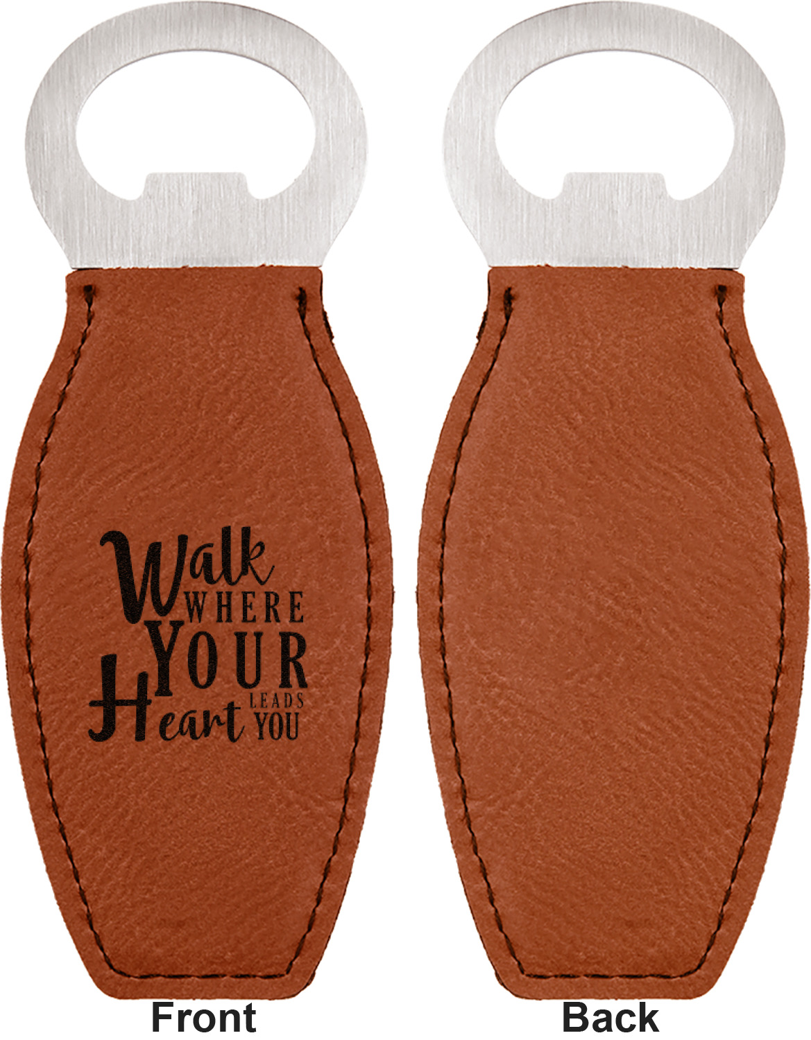 Built from stainless steel, these custom bottle openers are wrapped in a cognac-colored leatherette. Sharp, black stitching lines the edges for extra durability and a finished touch. Your personalization is laser-engraved onto the surface of this leatherette, leaving behind a crisp, black coloration. At 4.6 by 1.8 inches, this beer bottle opener gives you much of leverage when trying to open a stubborn bottle. On the opposite end of the opener, you'll find a magnet that you can use to display your new, unique bottle opener!