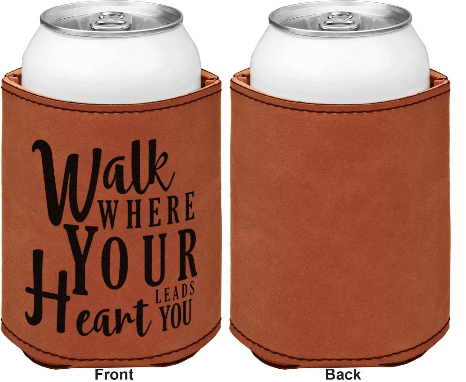This can sleeve is made from a cognac-brown leatherette and stitched with a sturdy, black thread. A slim padding lines the inside of your can sleeve to allow for a better fit once your drink is inserted. The sleeve itself measures at 4 by 4.5 inches, allowing this custom can sleeve to accommodate most canned drinks. Your personalized design can be engraved on the front and back, or solely the front. When laser-engraved, your design appears as a black coloration which contrasts the leatherette nicely.