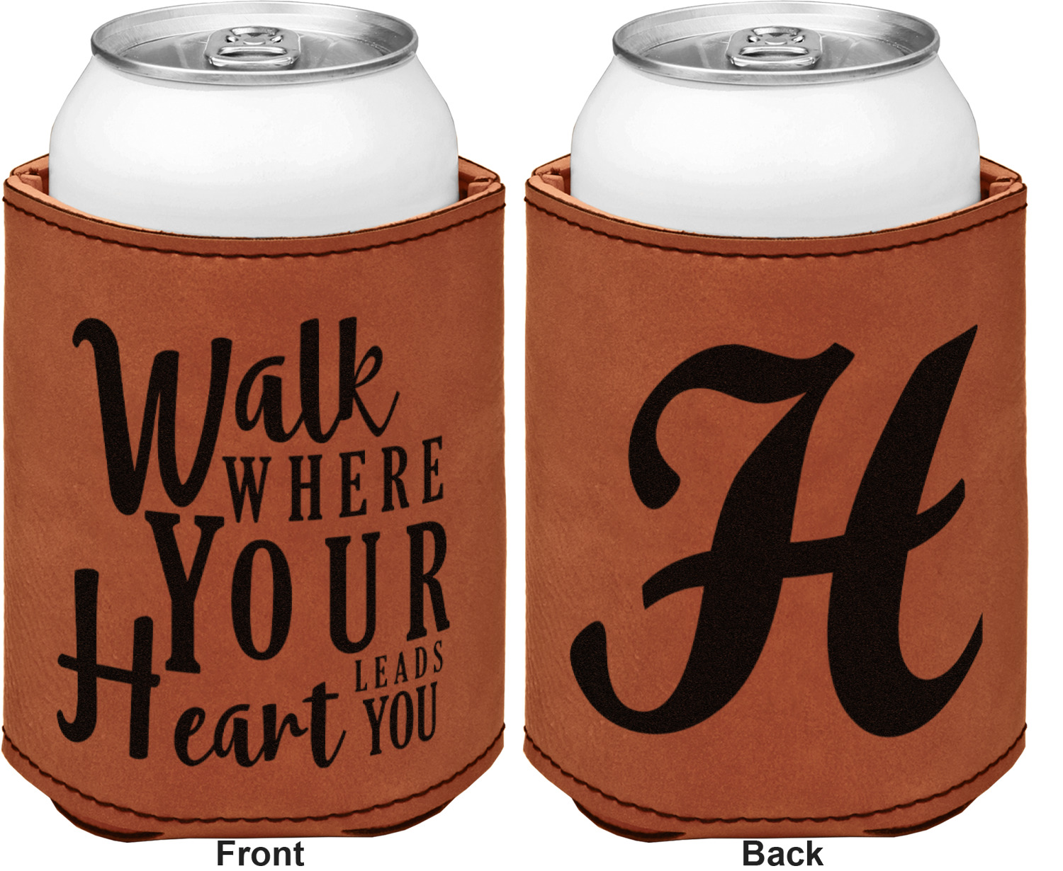 This can sleeve is made from a cognac-brown leatherette and stitched with a sturdy, black thread. A slim padding lines the inside of your can sleeve to allow for a better fit once your drink is inserted. The sleeve itself measures at 4 by 4.5 inches, allowing this custom can sleeve to accommodate most canned drinks. Your personalized design can be engraved on the front and back, or solely the front. When laser-engraved, your design appears as a black coloration which contrasts the leatherette nicely.