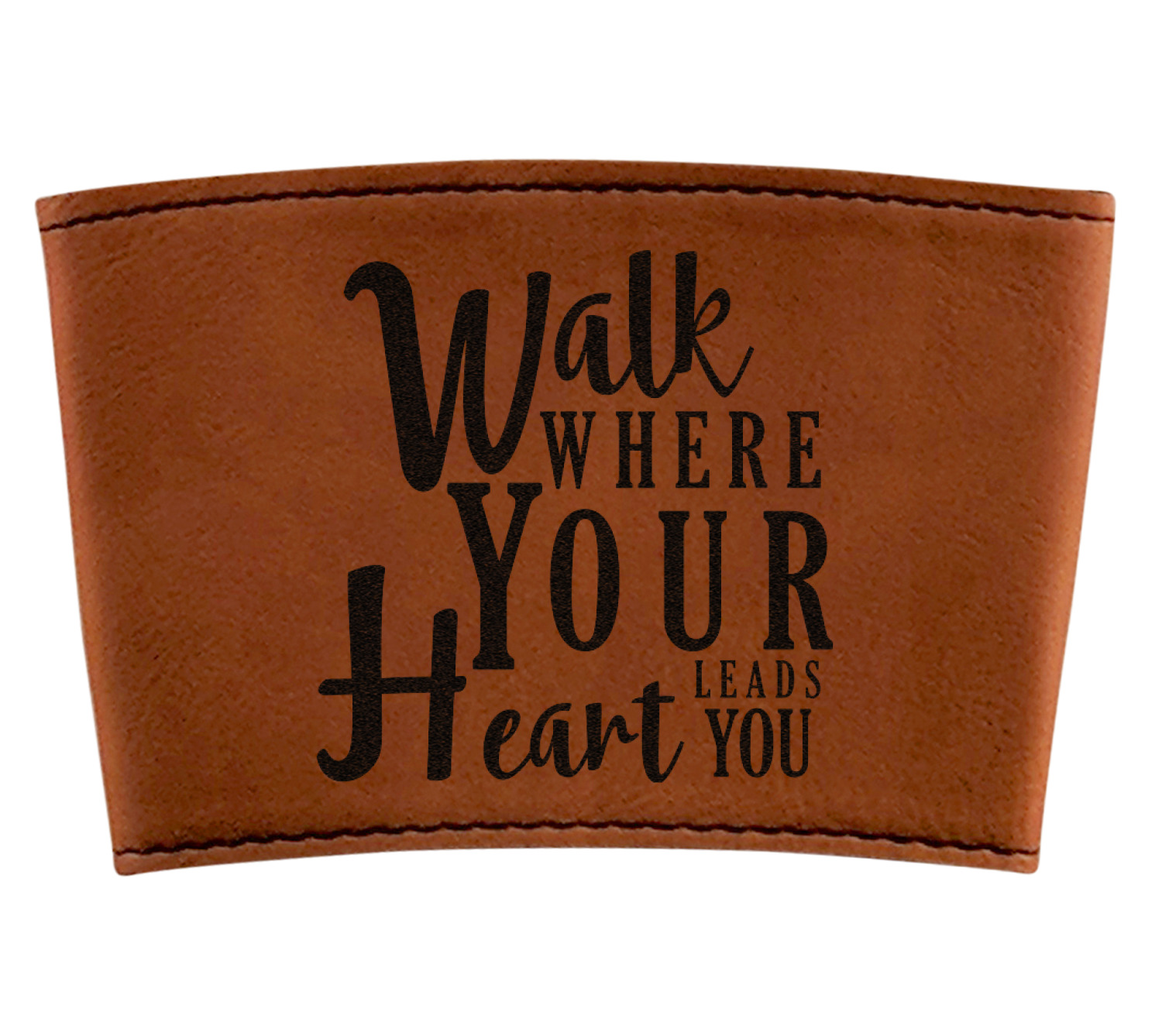 This cup sleeve is made from a suave, cognac-brown leatherette and finished with an intricate, black stitch. The interior of this can sleeve is fabricated from a thin foam material to help insulate your mug's contents. The sleeve is specifically made to suit tapered glasses or mugs, so the top's diameter is 3.5 inches, while the bottom's diameter is 2.75 inches. Your customized design will be laser engraved into the leatherette, leaving behind crisp, black imprint. With these products, we provide you with the option of engraving the front and back, or the front only.