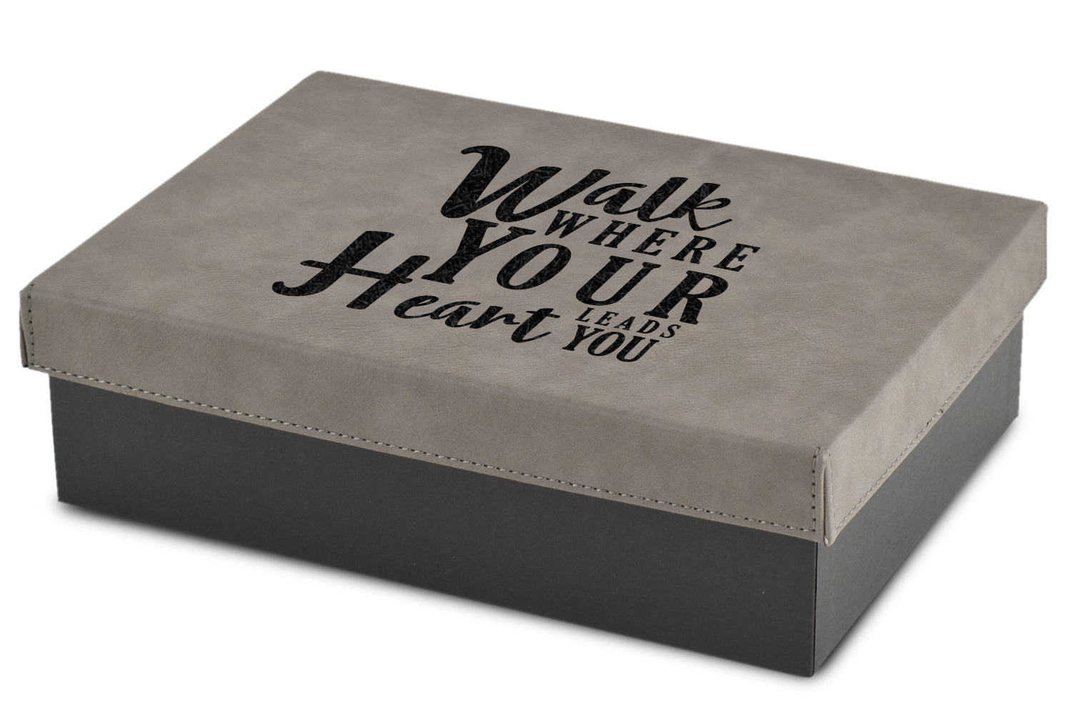 These gift boxes are available in 3 different sizes to accommodate various sized gifts. Available in gray as a neutral color for any occasion as well as to showcase your design boldly. Engraved with a laser this high quality paper board and faux leather gift box is unique and makes any gift stand out.