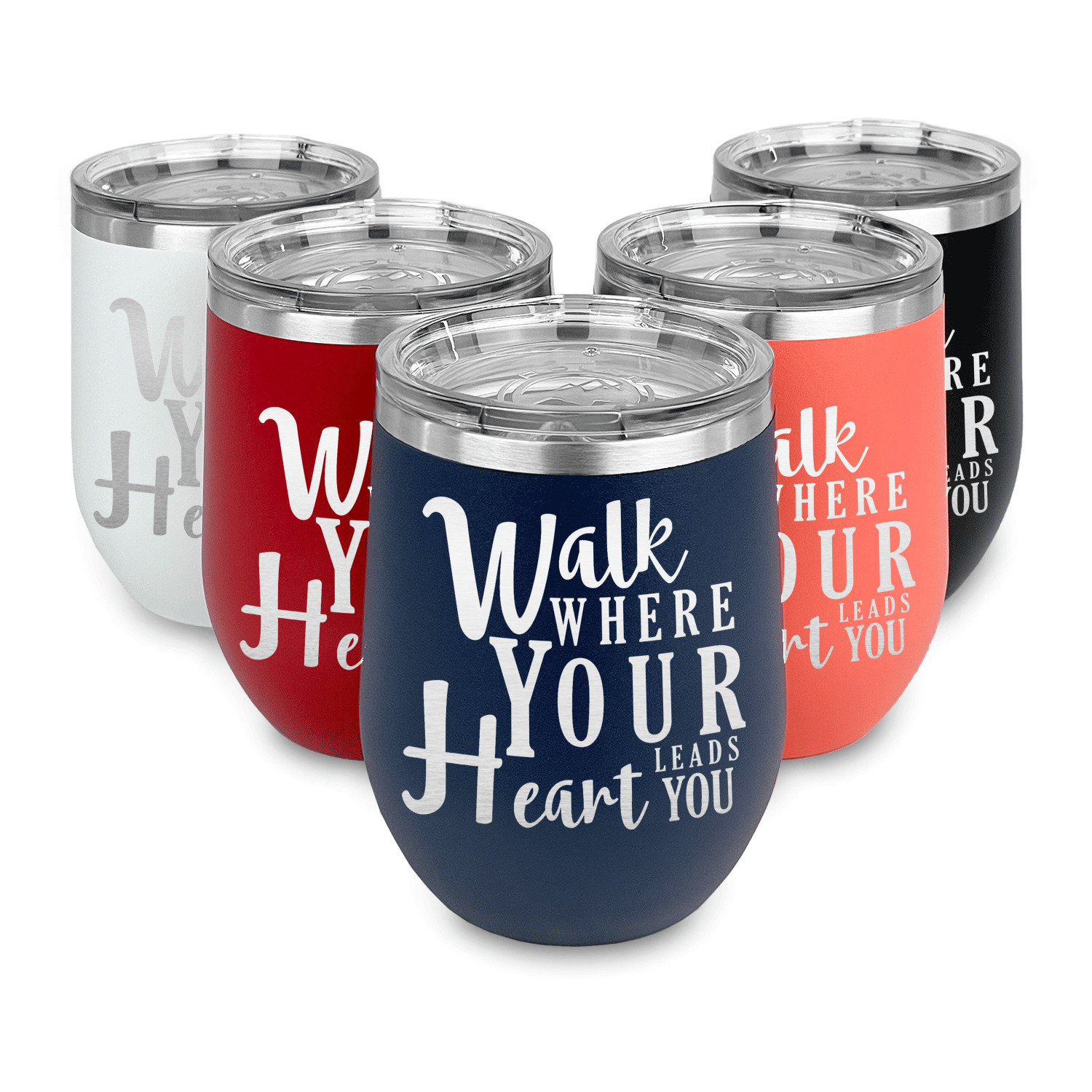 Design your wine tumbler with a cool graphic or quote. Even put your initials or monogram! These cups are laser engraved, which looks extra sharp on the metal tumbler.
