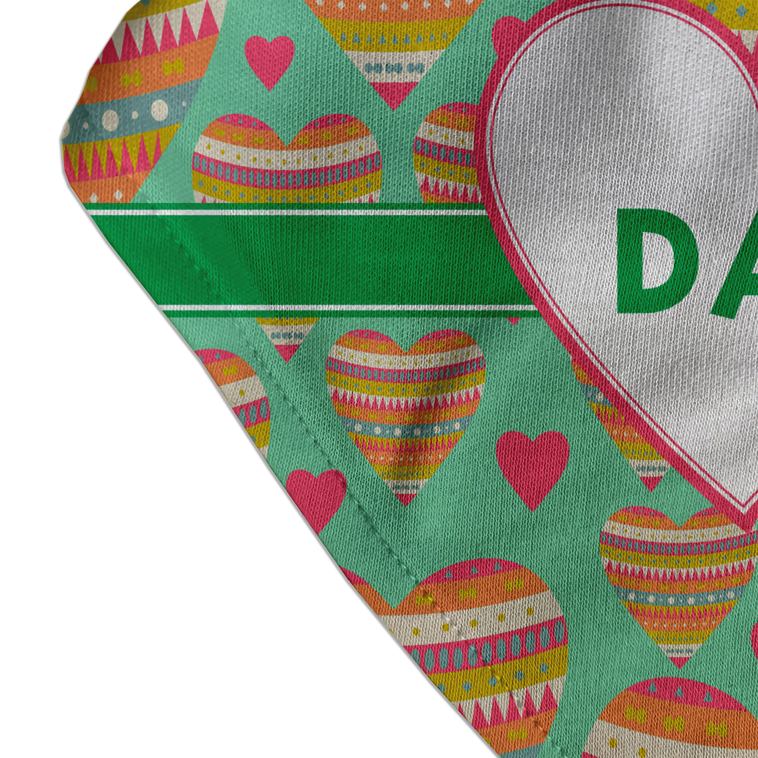 This Valentine's Day design looks sweet enough to eat. Multicolored hearts, each one filled with stripes and triangles and patterns of all kinds, are set on a crisp white background.